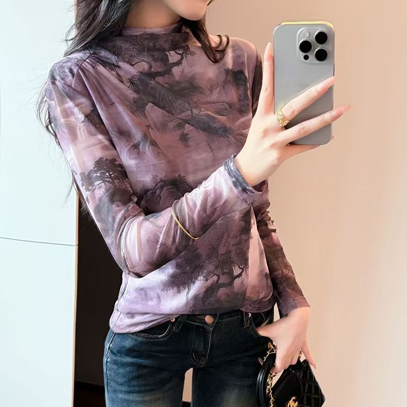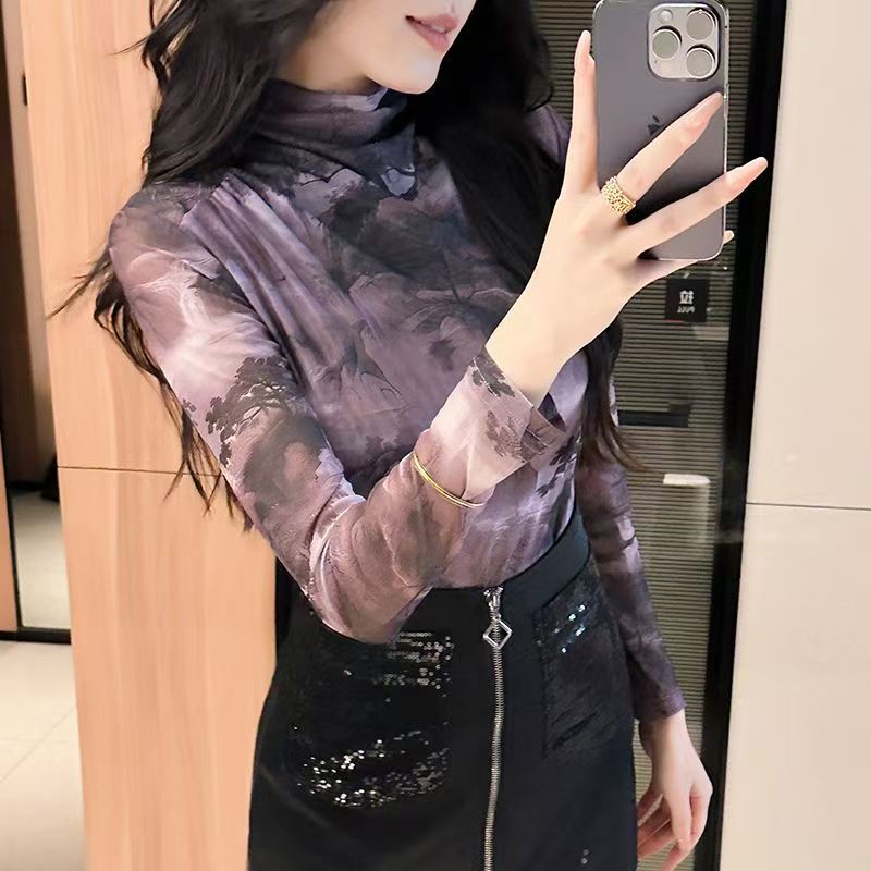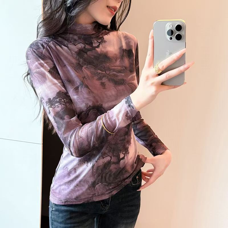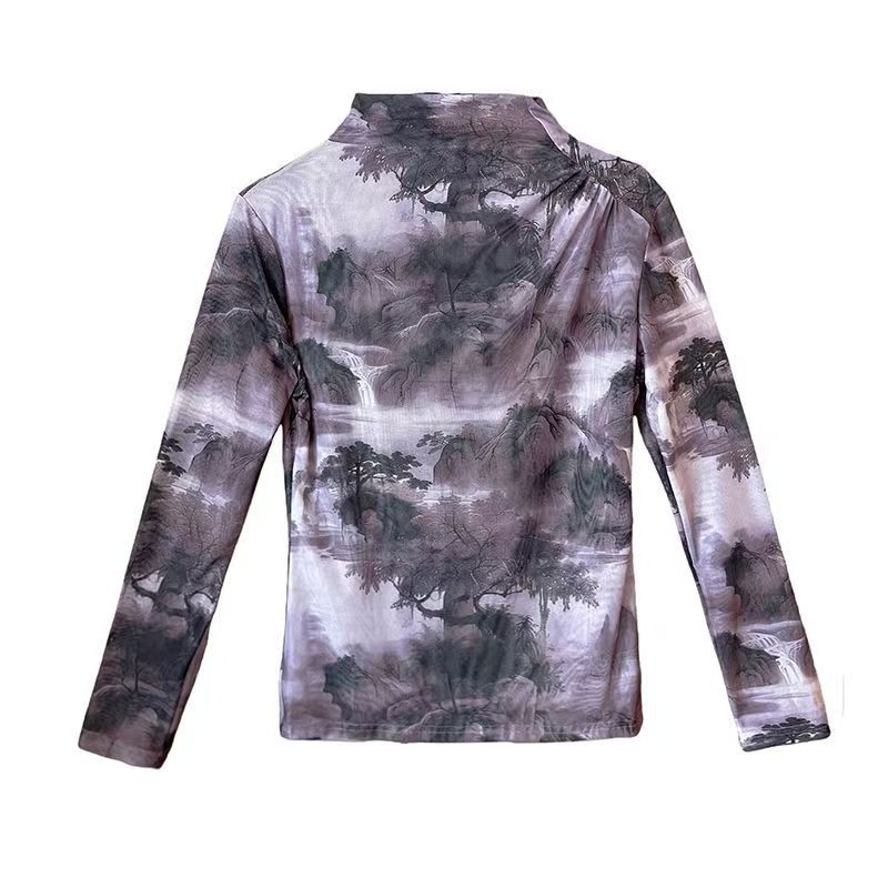 YF6083-图片色春秋山水印花长袖半高领网纱弹力修身显瘦小众设计蕾丝衫