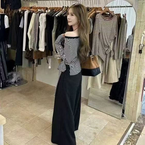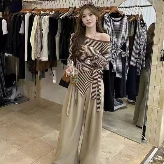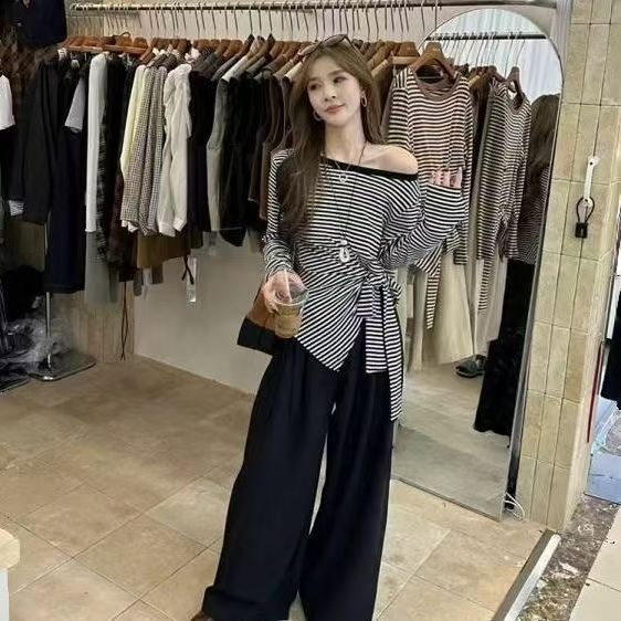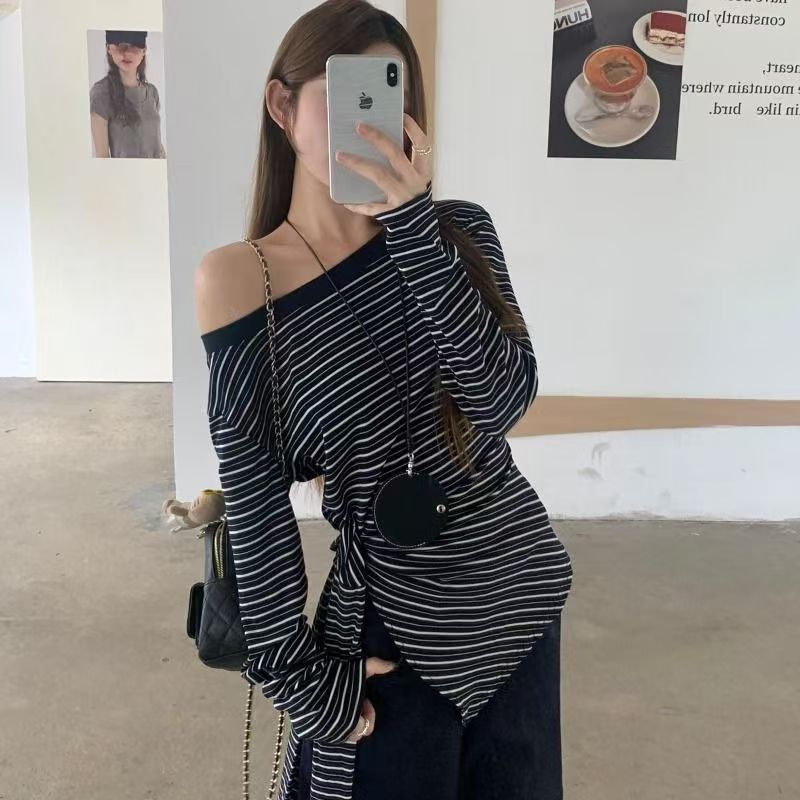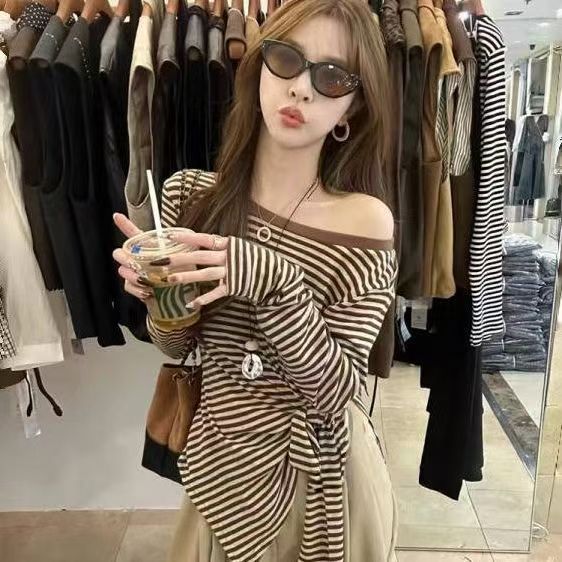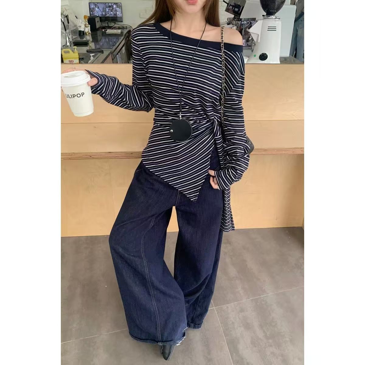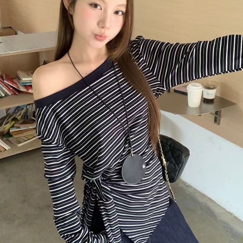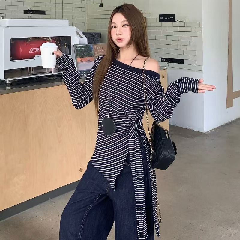 YF6084-(2色入内)时尚春秋不规则小众设计侧绑绳条纹露肩长袖大码上衣
