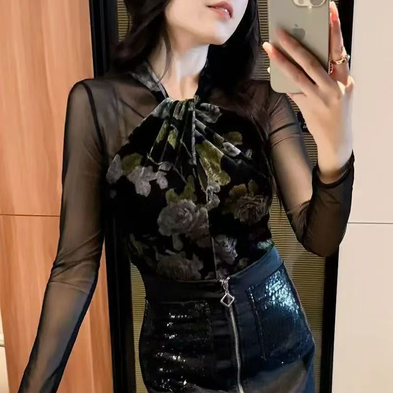YF6091-(2色入内)春秋名媛风提花丝绒网纱拼接复古风长袖系领设计上衣