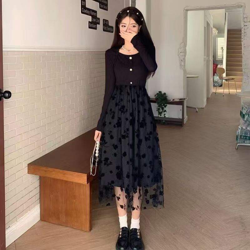 YF6094-图片色甜美时尚赫本风长袖套头排扣拼接网纱复古气质黑色连衣裙