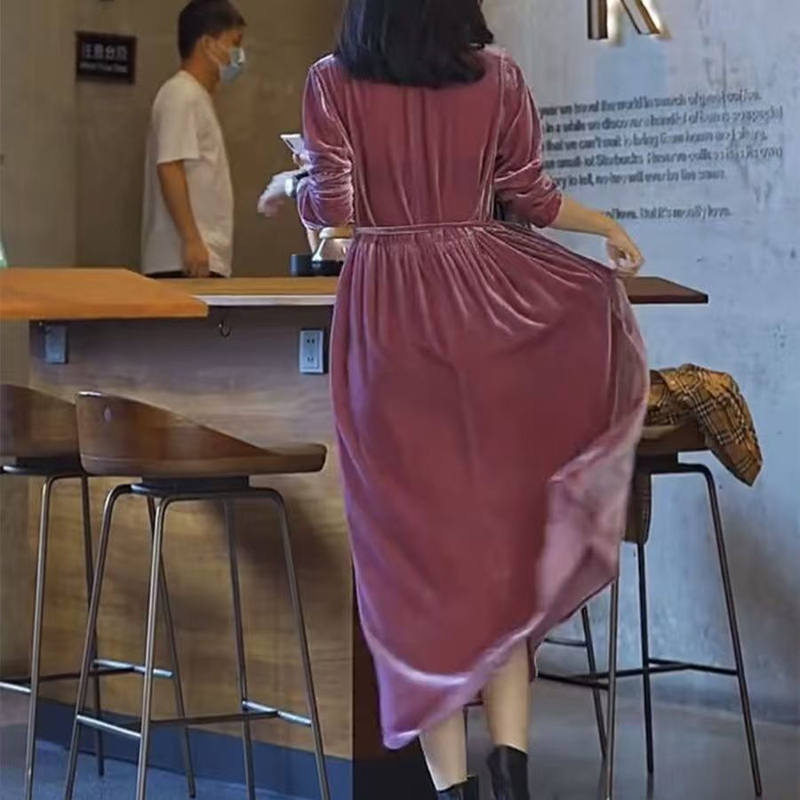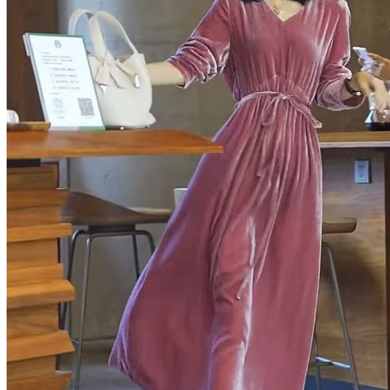 YF6095-图片色名媛气质金丝绒秋冬保暖长袖V领绑带显瘦中长款连衣裙