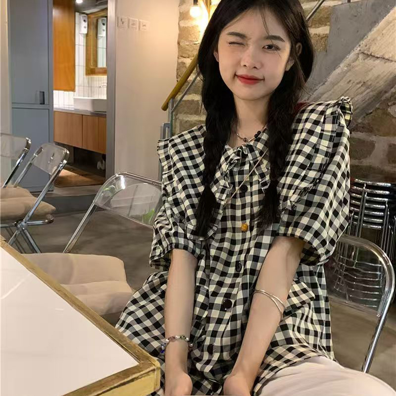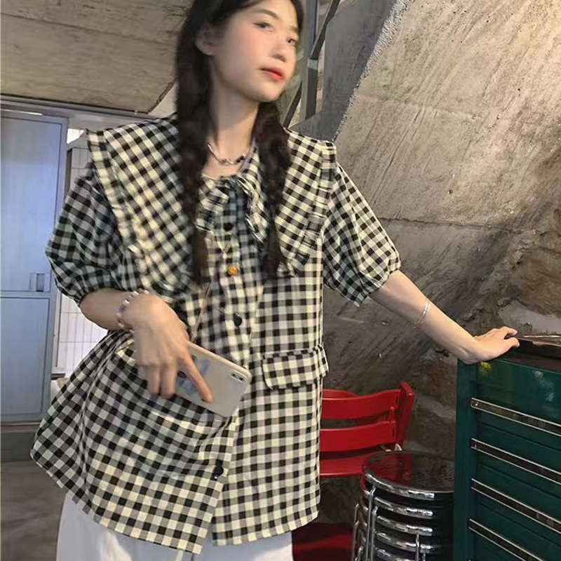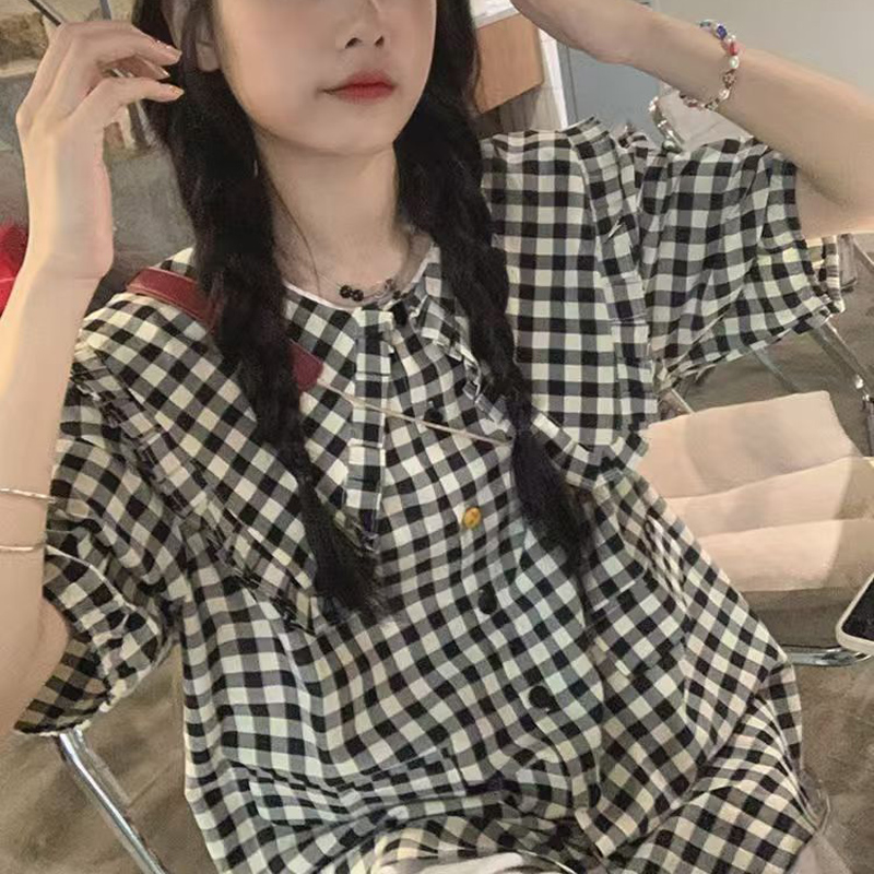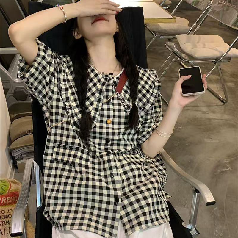YF6097-图片色复古娃娃装翻领排扣设计短袖宽松大码格子设计气质感上衣