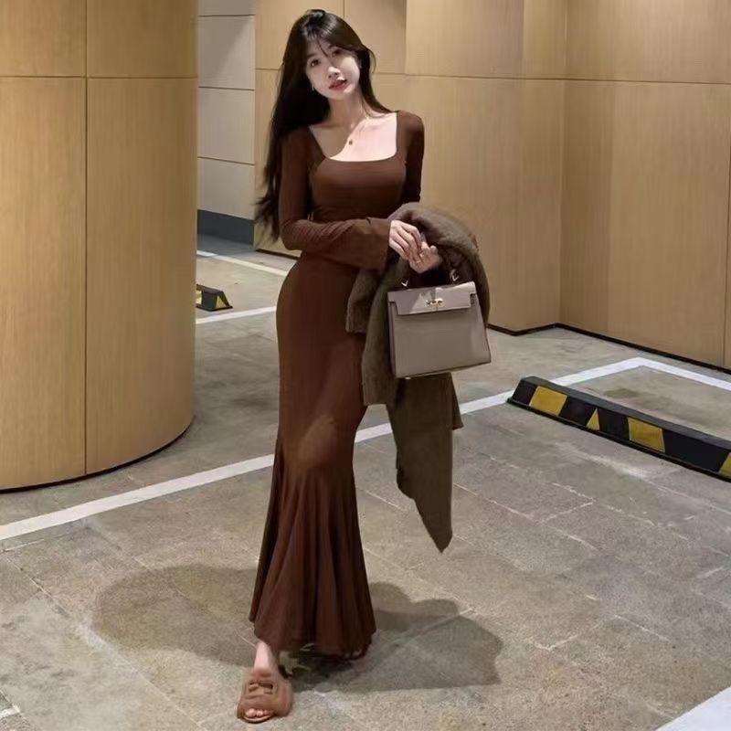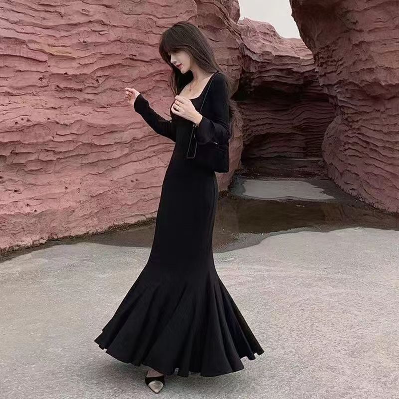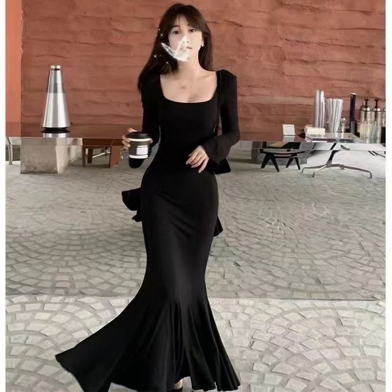 YF6100-图片色名媛气质鱼尾设计坠地感春秋新款长袖方领弹力修腰包臀长裙