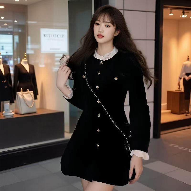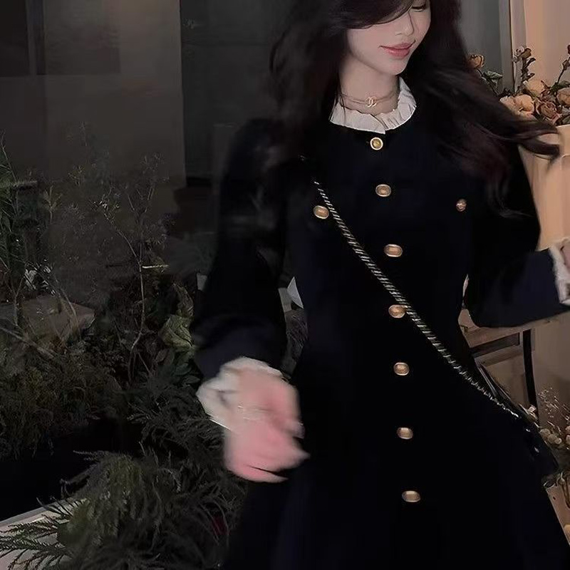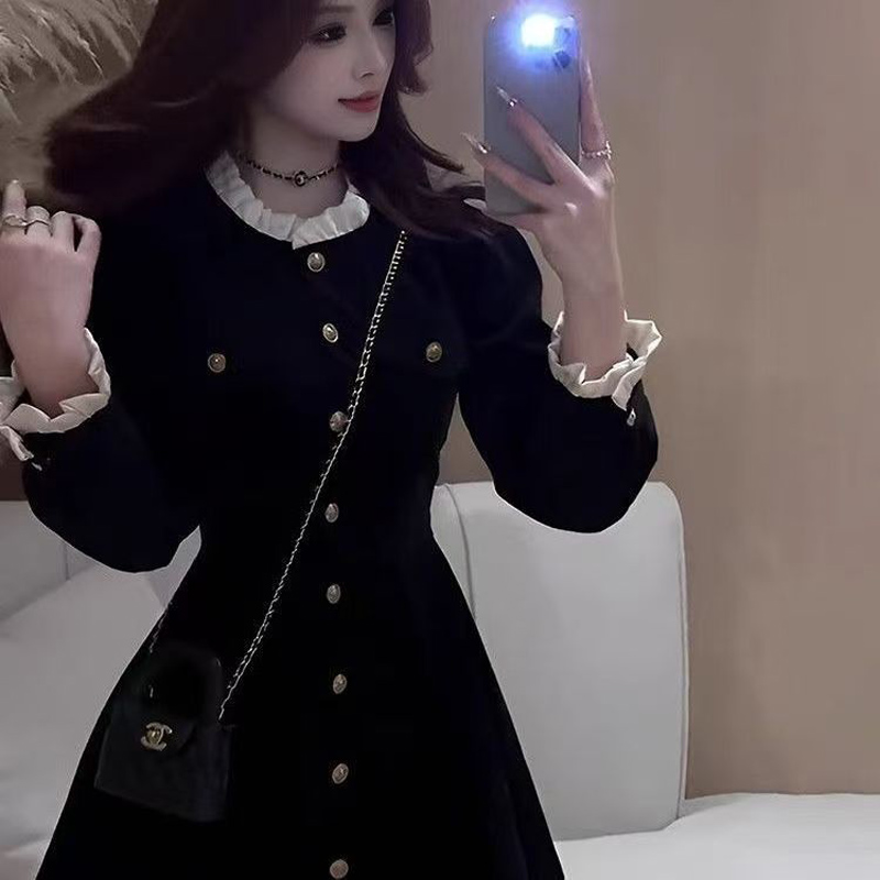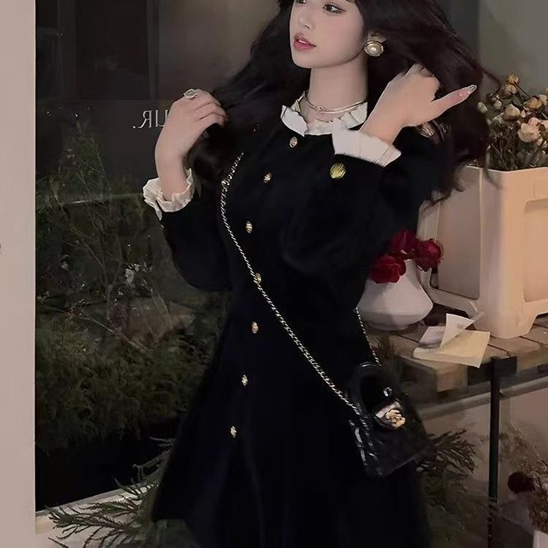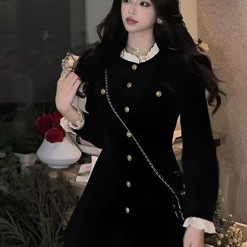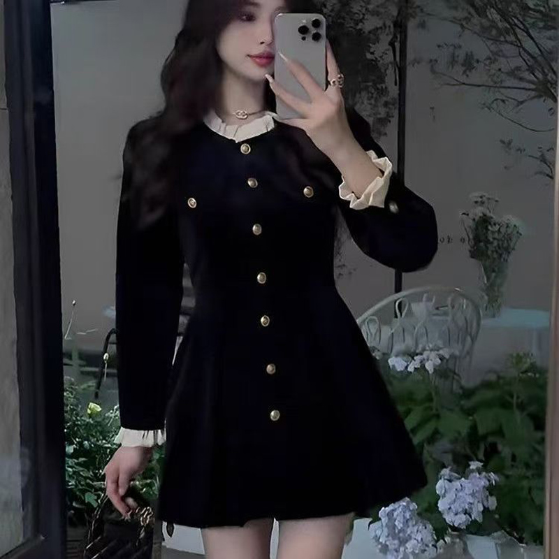 YF6101-图片色小香风撞色长袖花边领设计排扣修腰中长款丝绒连衣裙