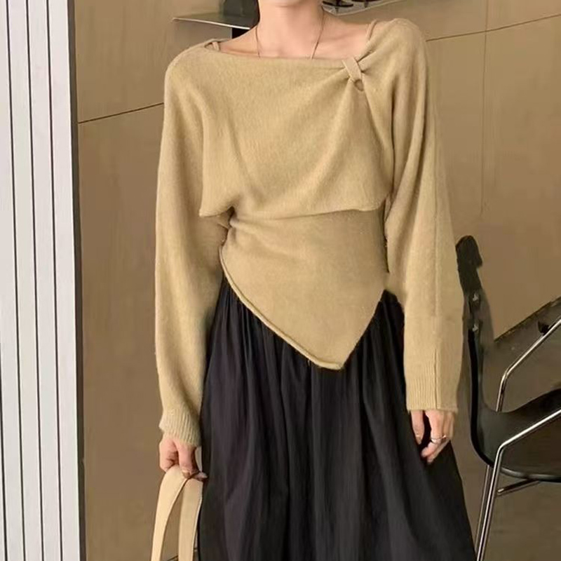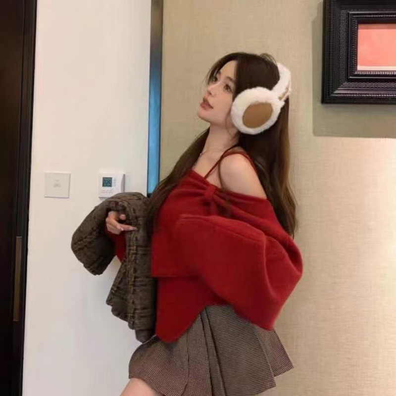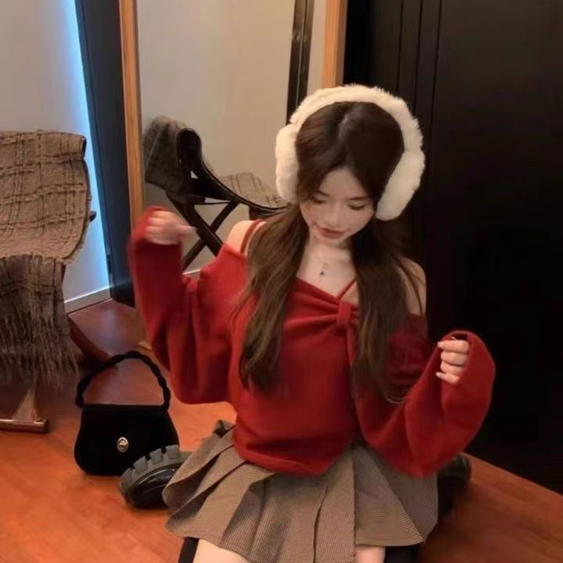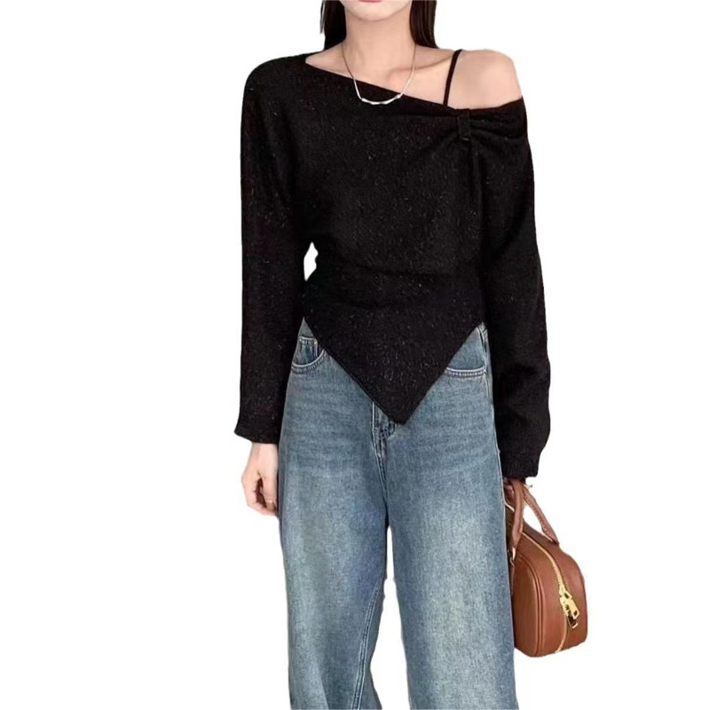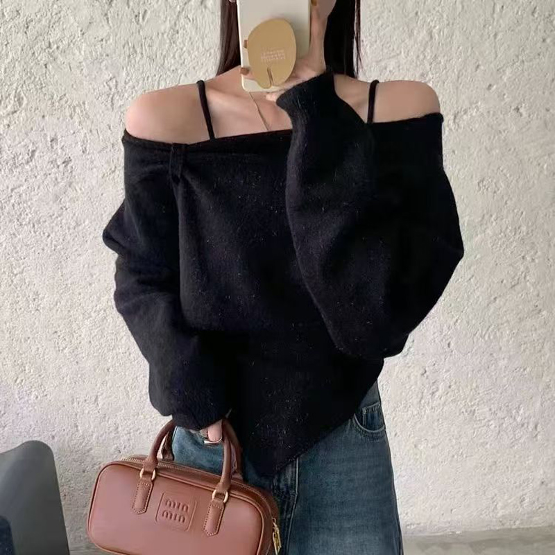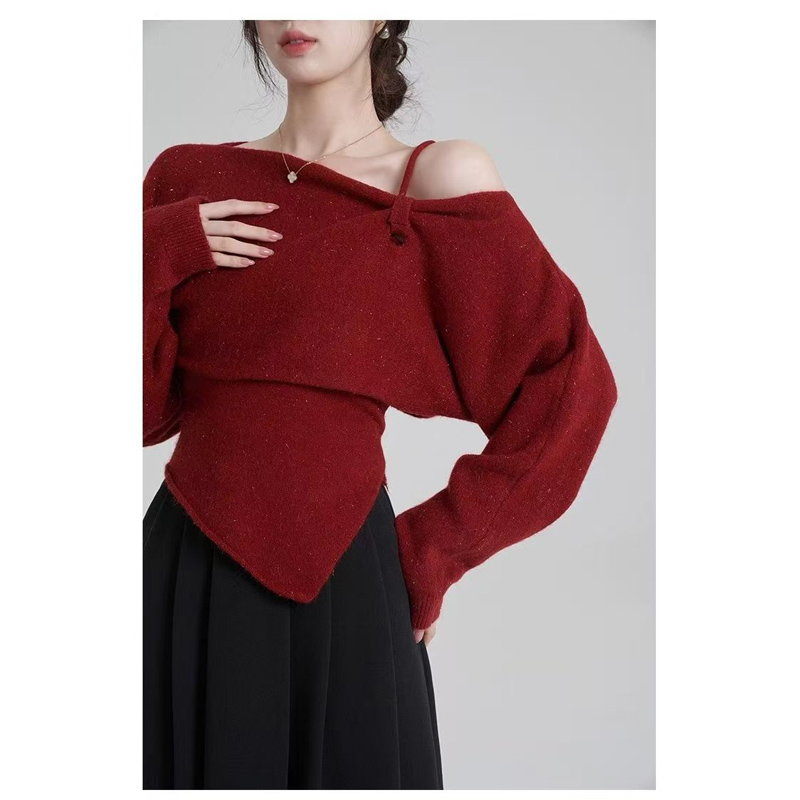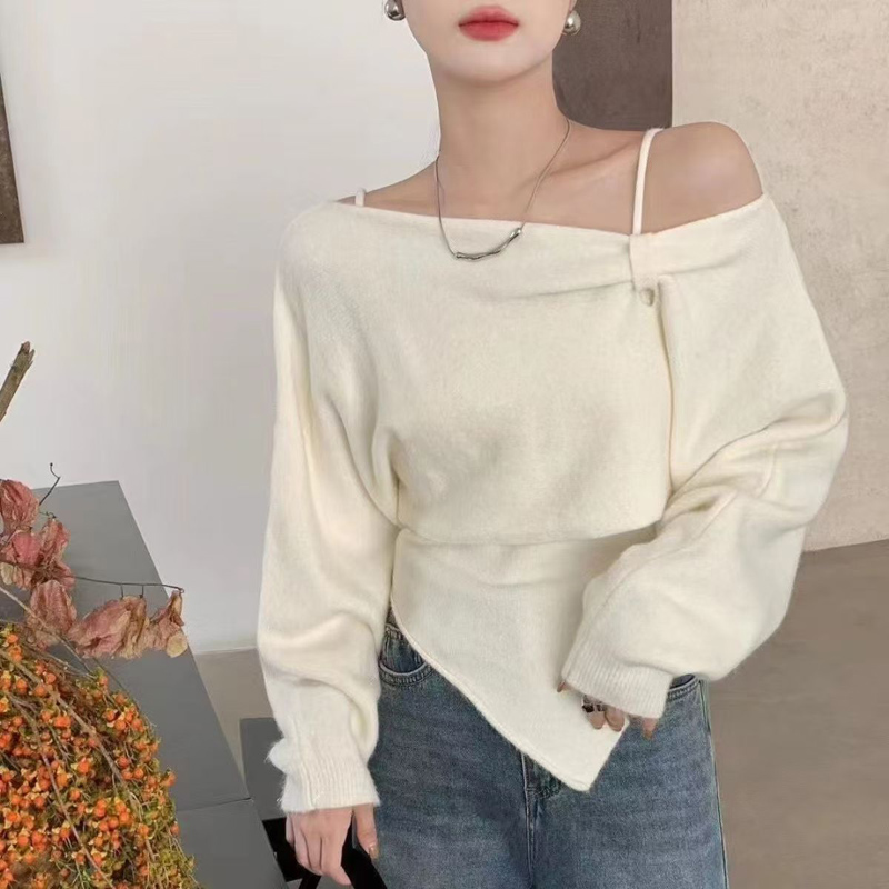 YF6112-(4色入内)冬季小心机设计两穿一字肩吊带不规则修身针织两件套