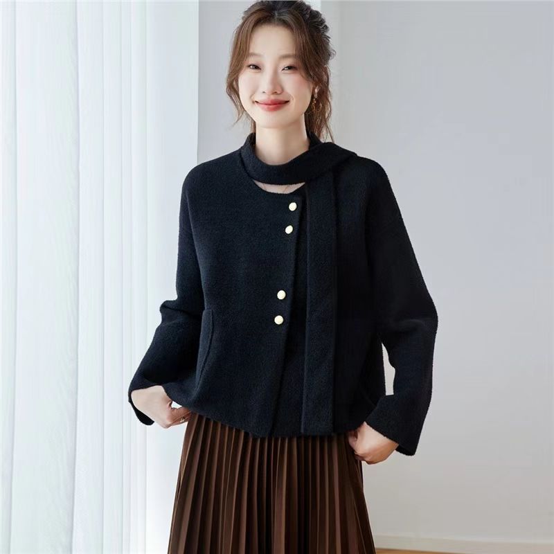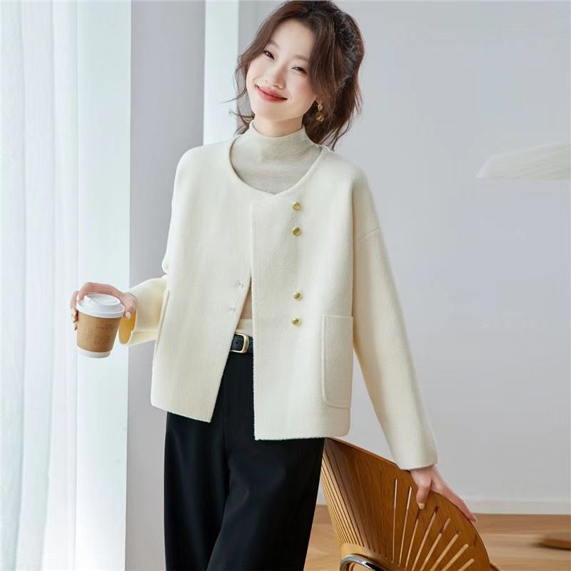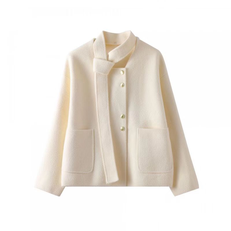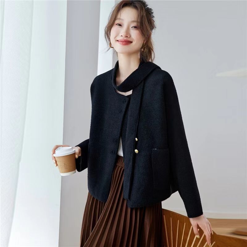 YF6119-(2色入内)冬装小香风长袖围脖排扣短款优雅气质毛呢开衫上衣