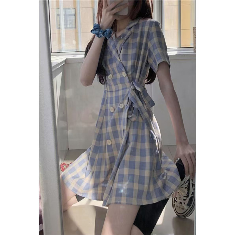 YF6120-图片色韩版格子短袖系腰带翻领夏季收腰显瘦复古气质连衣裙