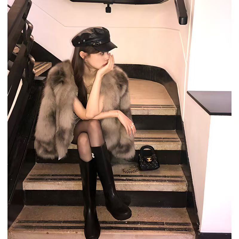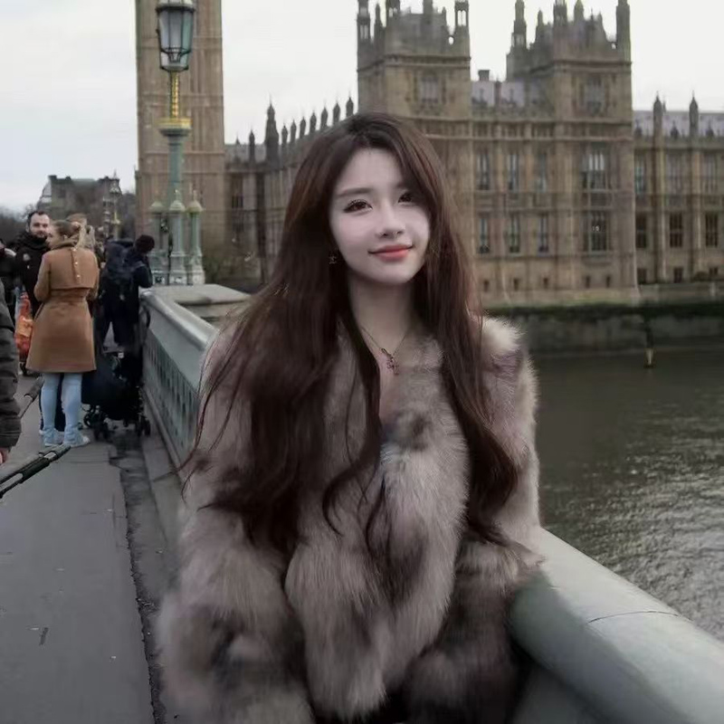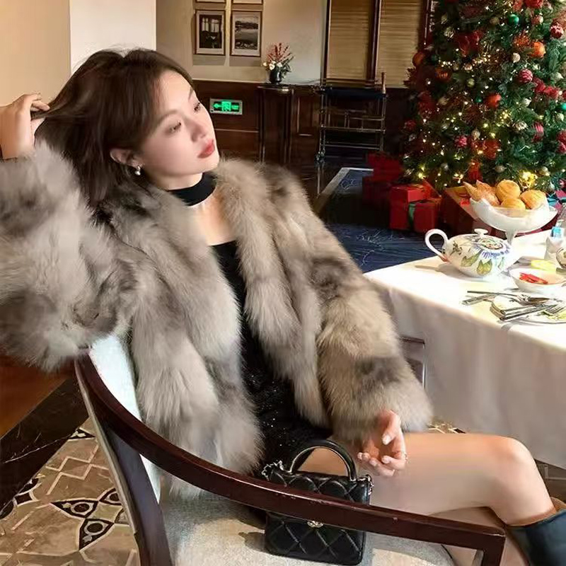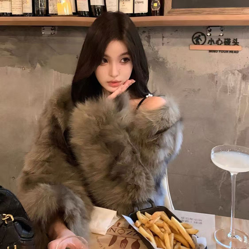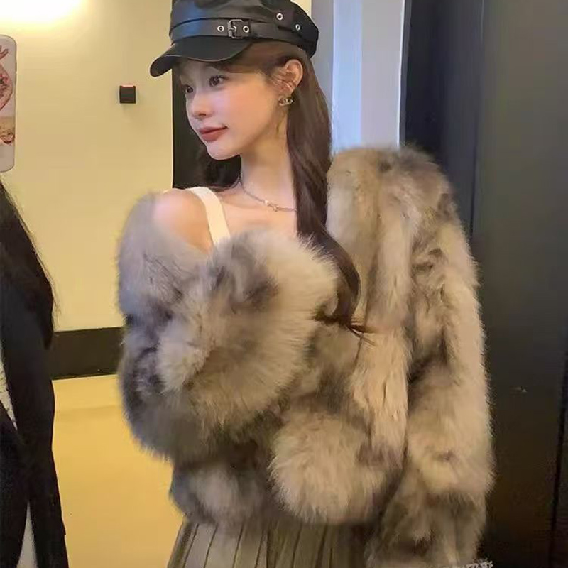 YF6127-图片色名媛气质仿狐狸皮草斑点设计宽松大码长袖开衫毛毛上衣