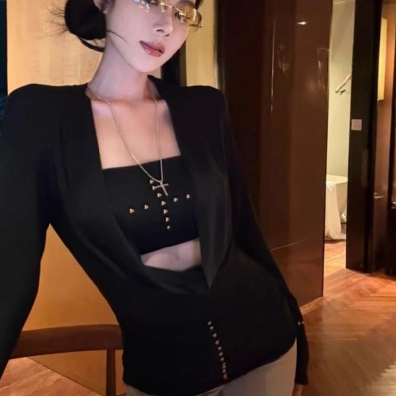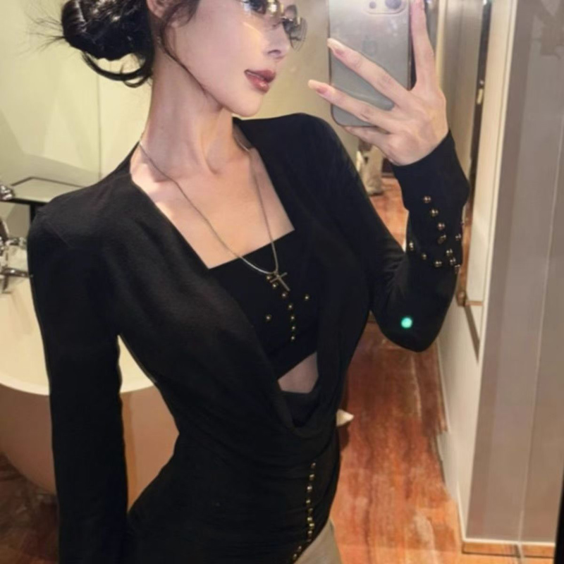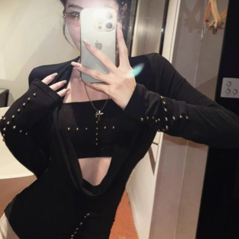 YF6132-图片色秋冬两件套铆钉十字装饰设计感长袖U字辣妹装弹力修身上衣