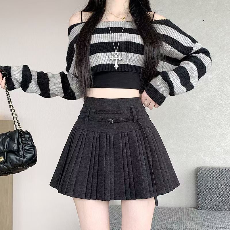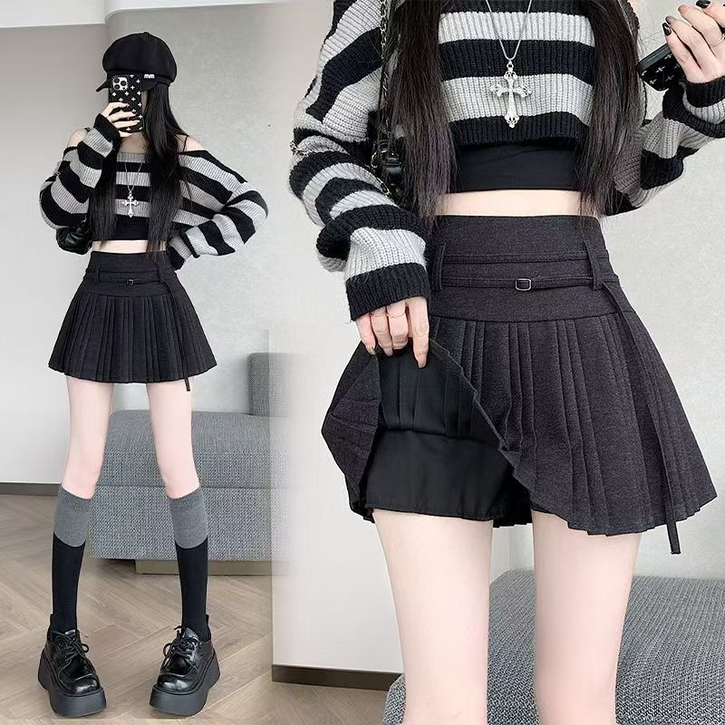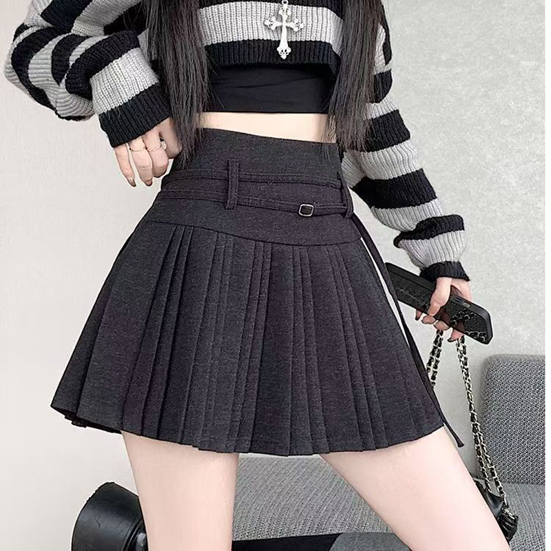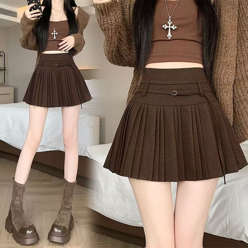 YF6137-(3色入内)冬季新款收腹高腰绑带褶折A字防走光保暖毛呢短裙