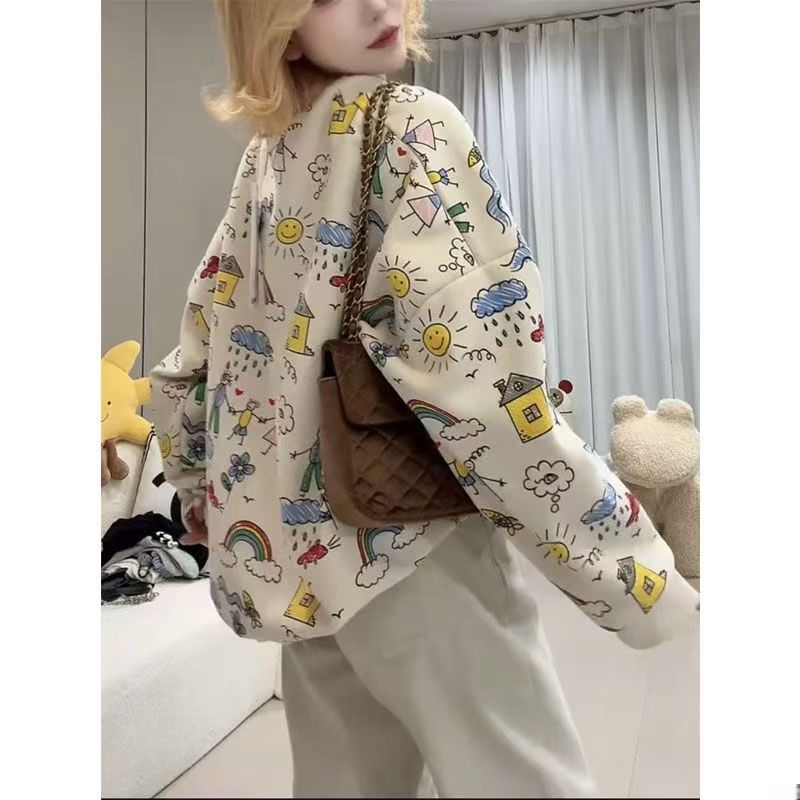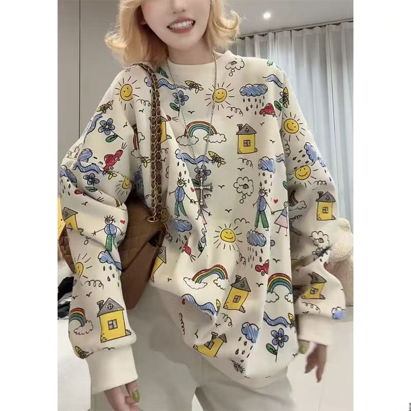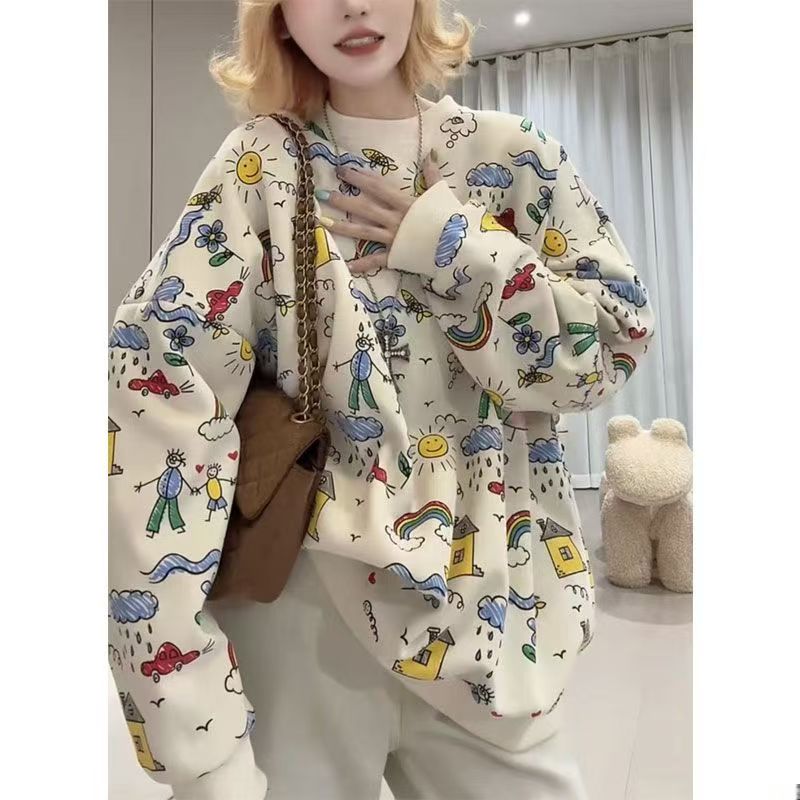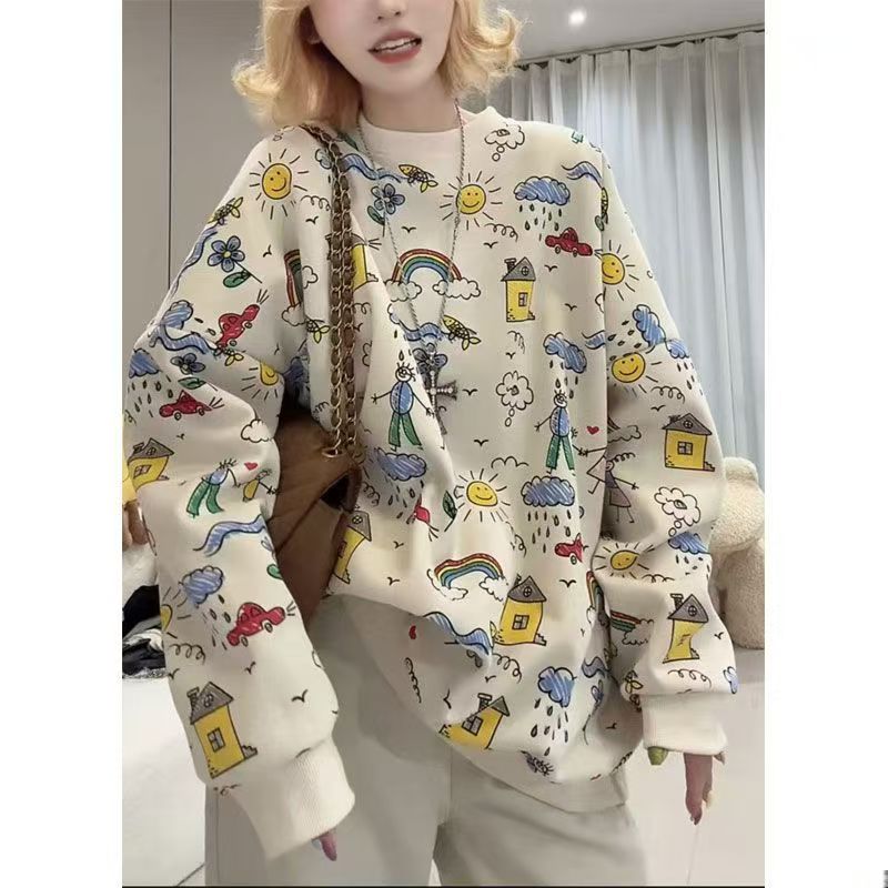 YF6142-图片色时尚洋气涂鸦慵懒风圆领大码INS气质原宿风日系卫衣