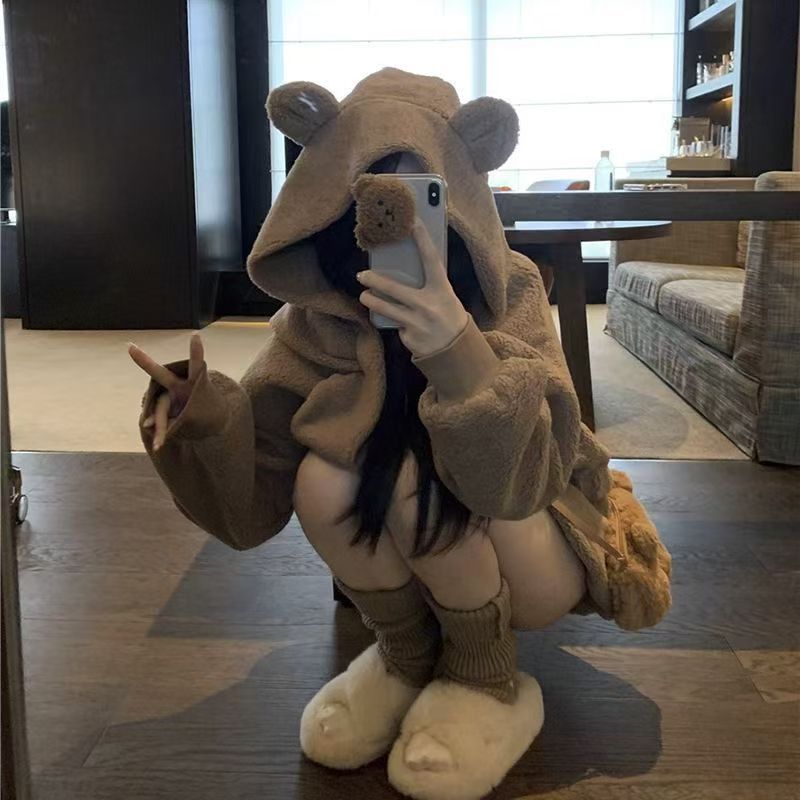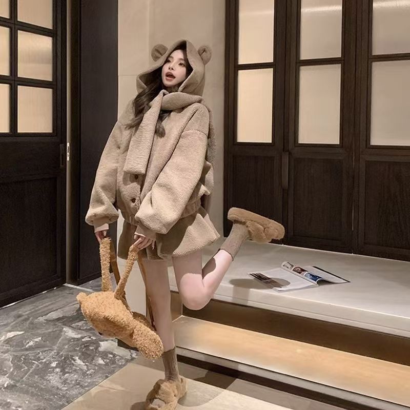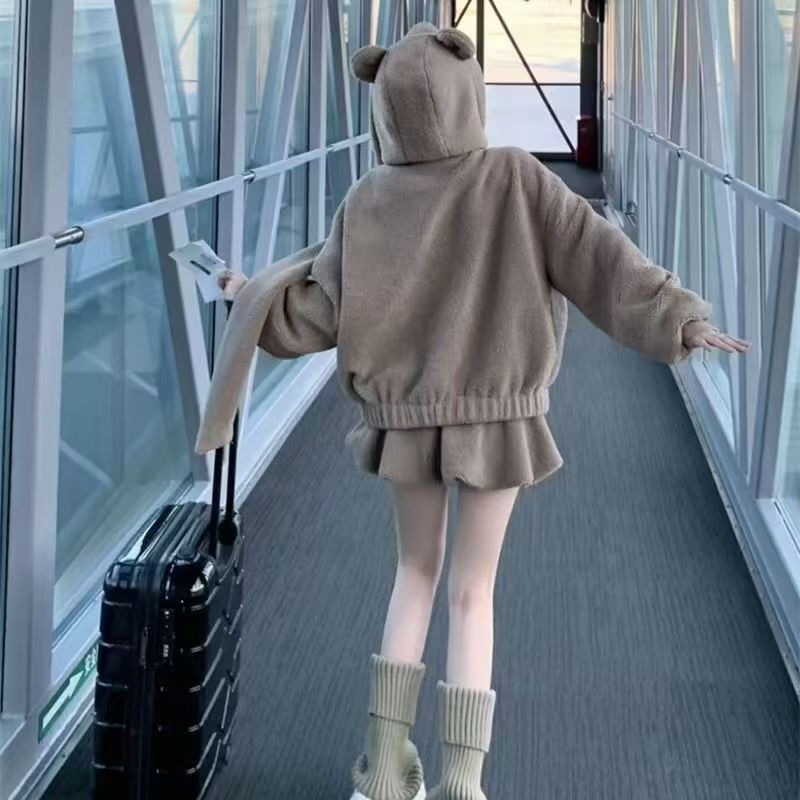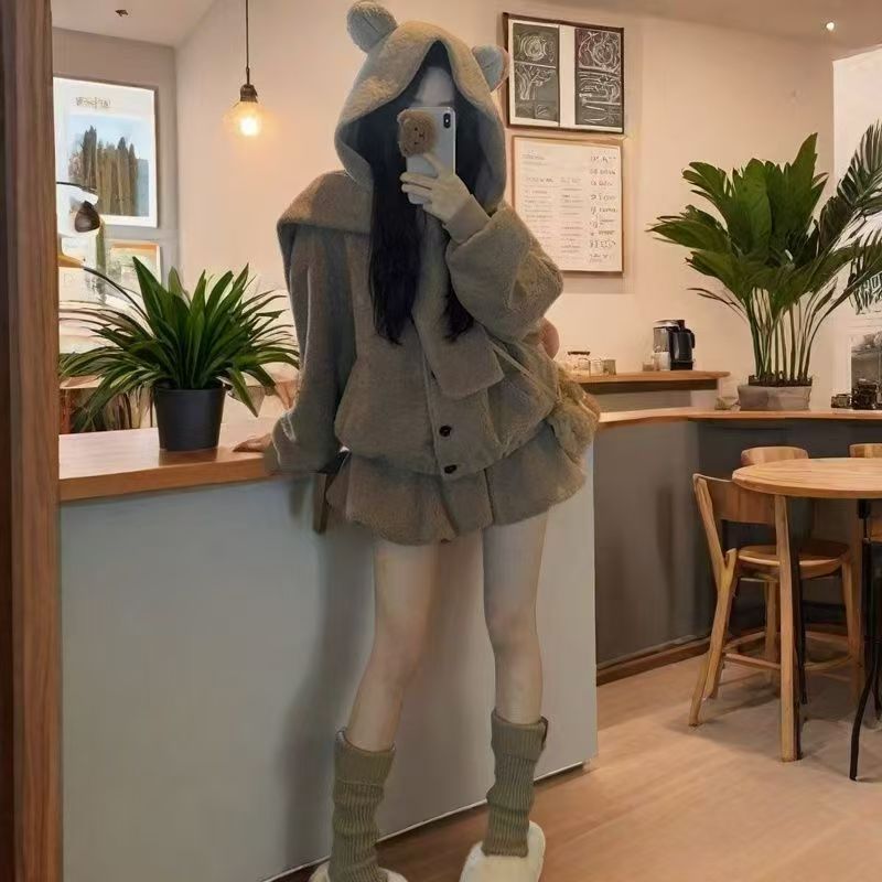 YF6143-图片色两件套冬季加绒长袖连帽熊熊设计系扣上衣花苞褶折短裙套装