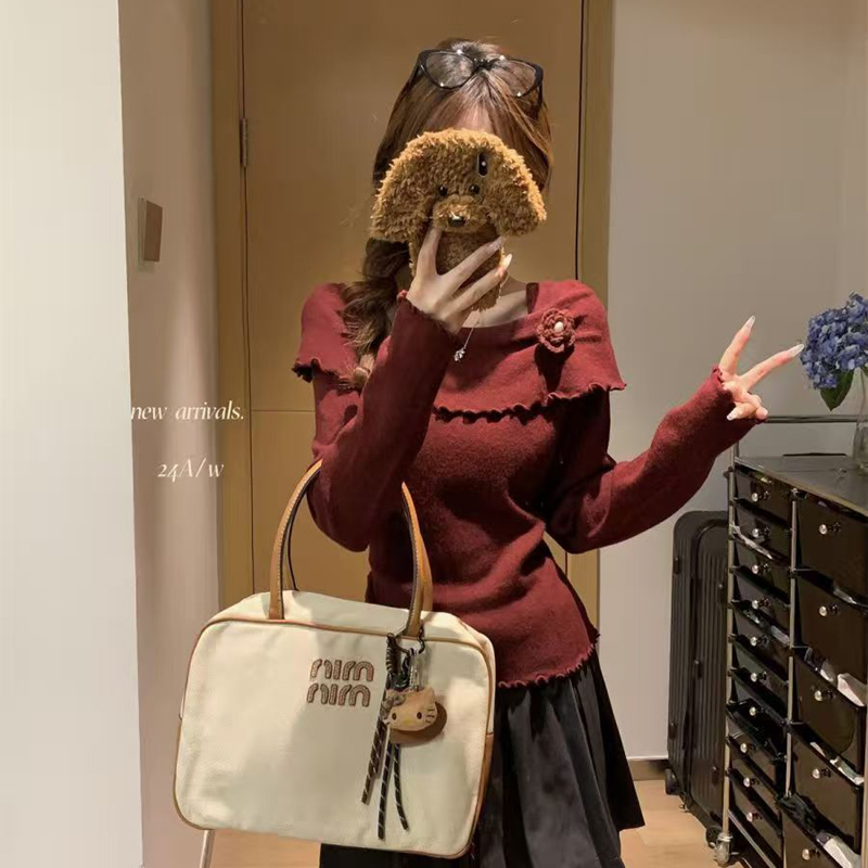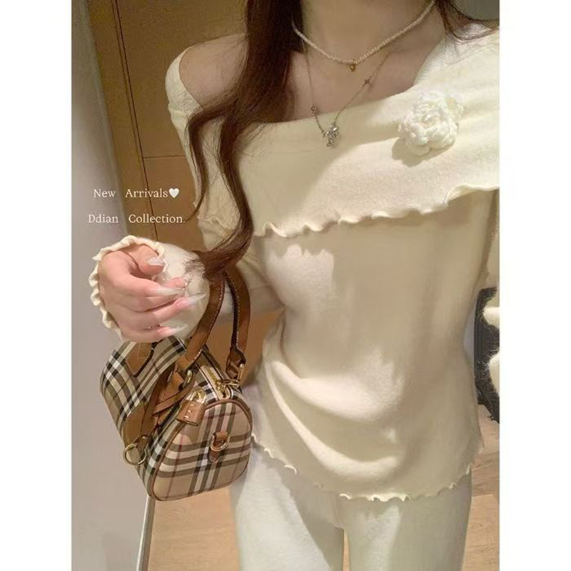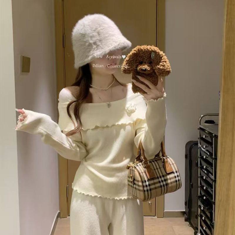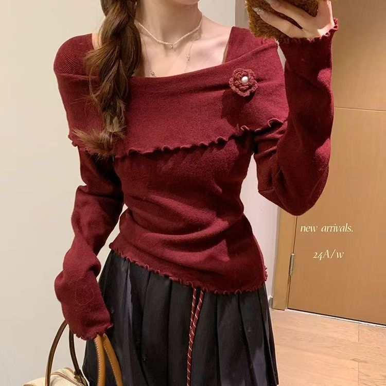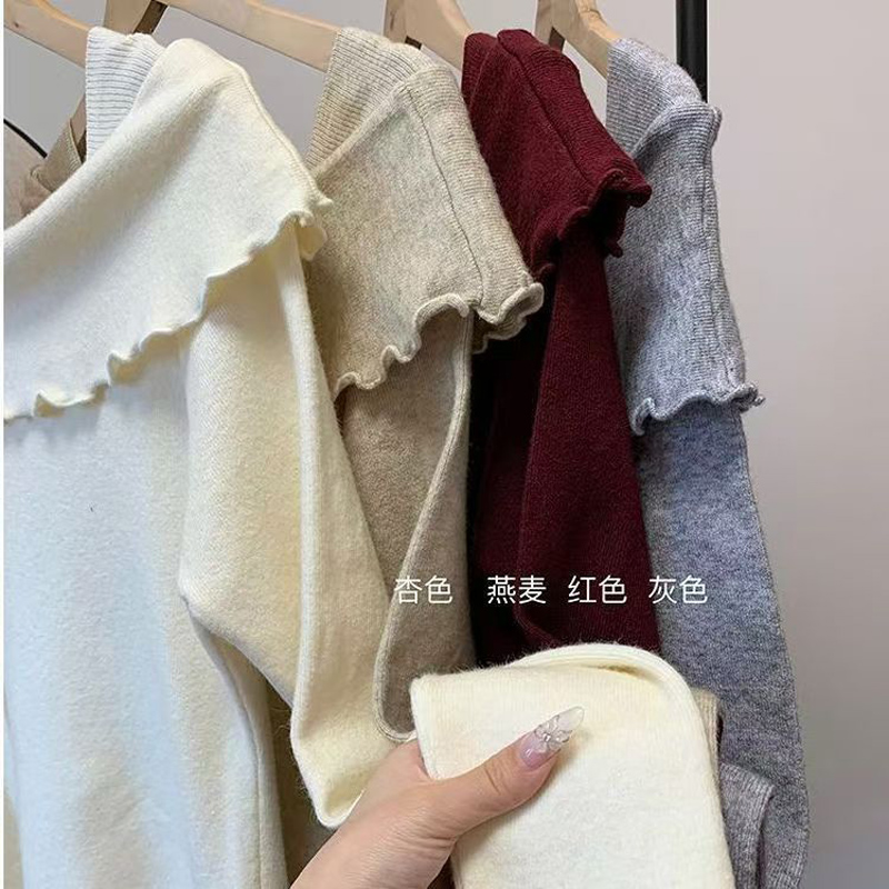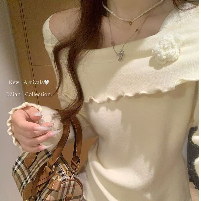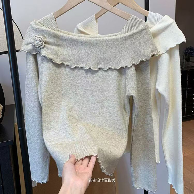 YF6145-(5色入内)玫瑰花一字肩设计长袖套头弹力修身木耳边针织上衣