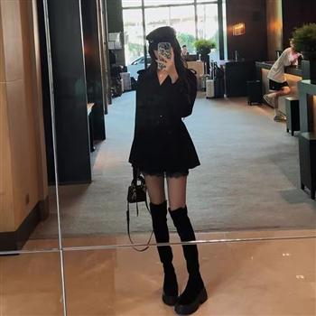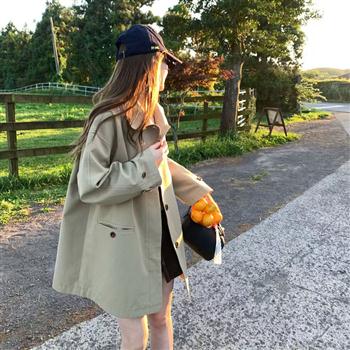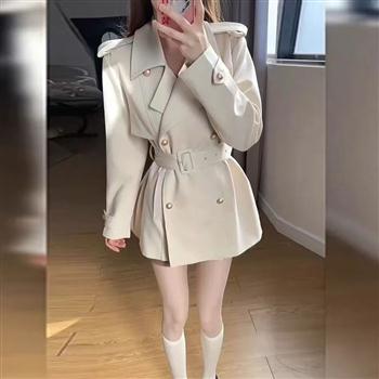 YF6146-(2色入内)赫本风秋冬长袖西装领排扣束腰绑带英伦风大码风衣外套