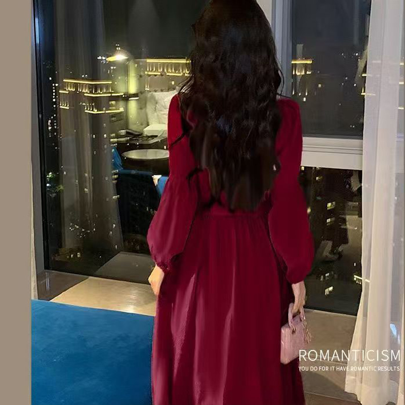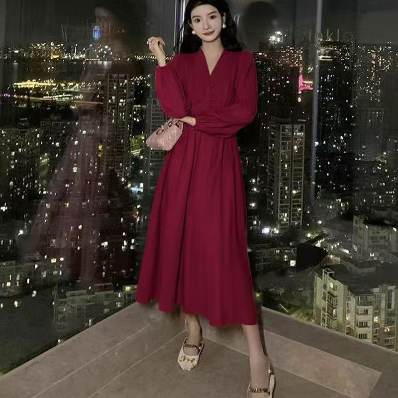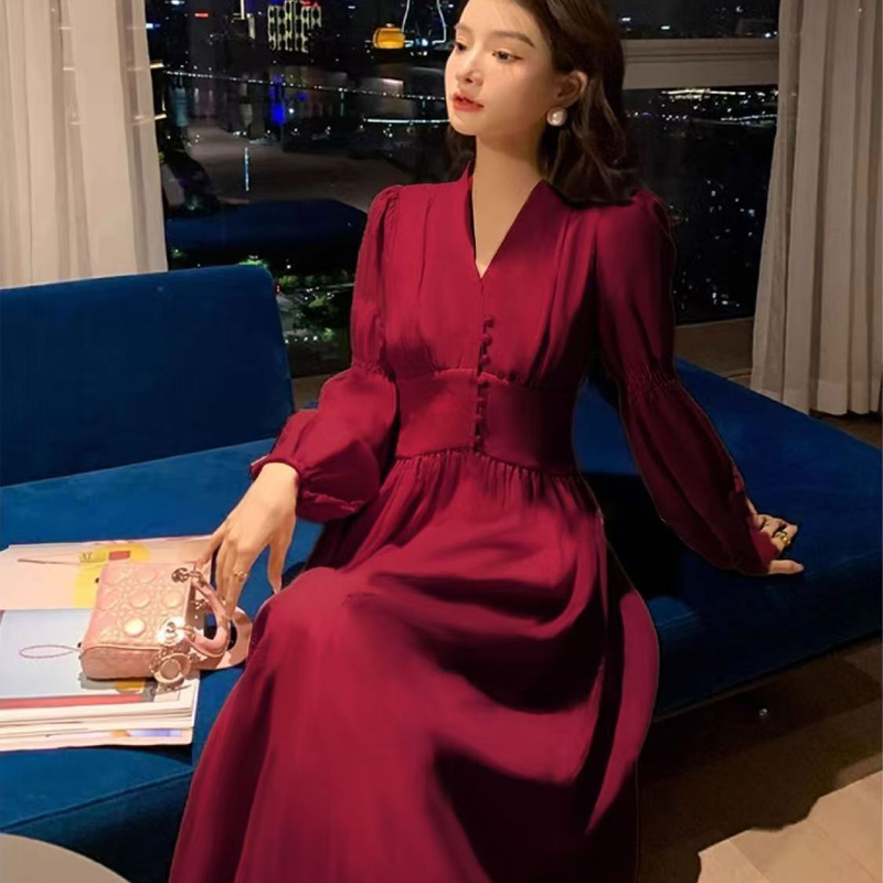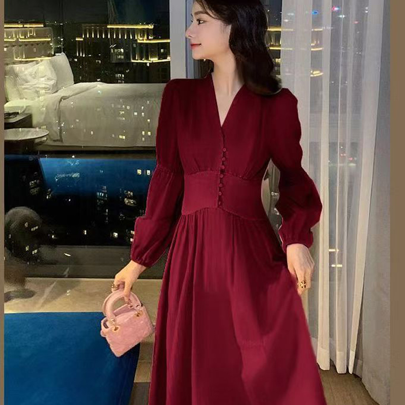 YF6147-图片色别致精品泡泡袖套头包扣收腰过膝酒红色圣诞节复古连衣裙