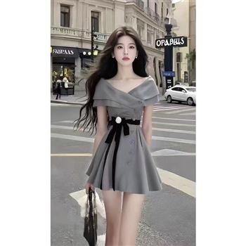 YF7175-图片色时尚精美一字肩叠式交叉V领短袖系蝴蝶结收腰素色连衣裙