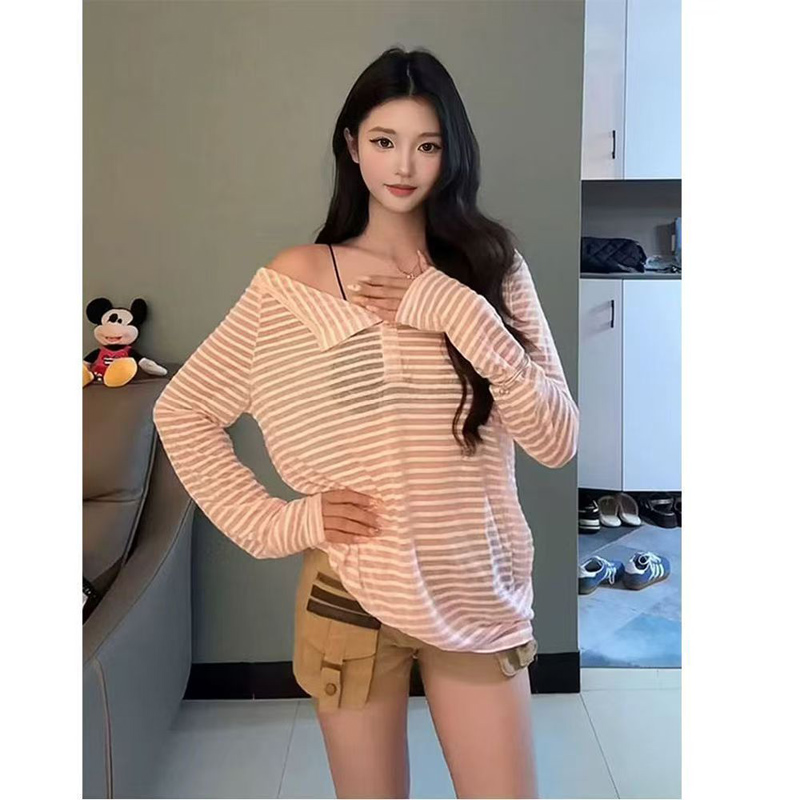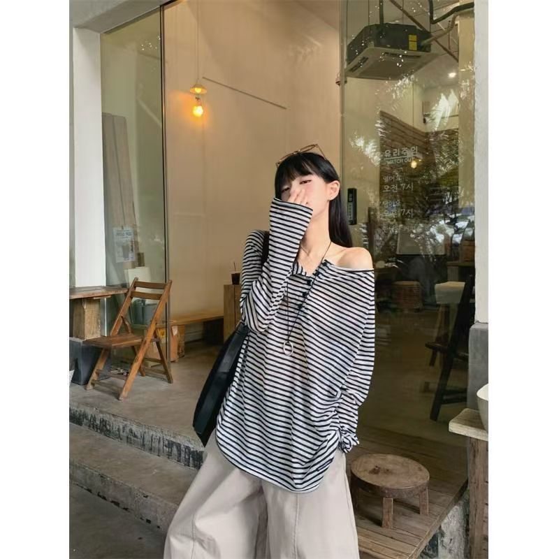 YF6149-(2色入内)时尚个性反领一字肩长袖条纹加大码显瘦休闲上衣