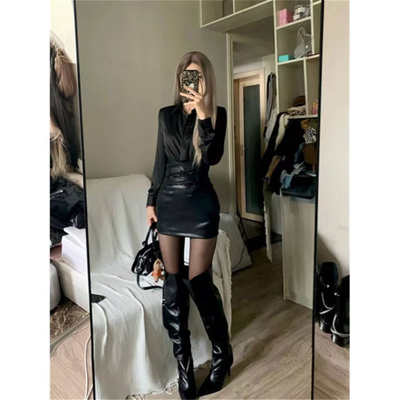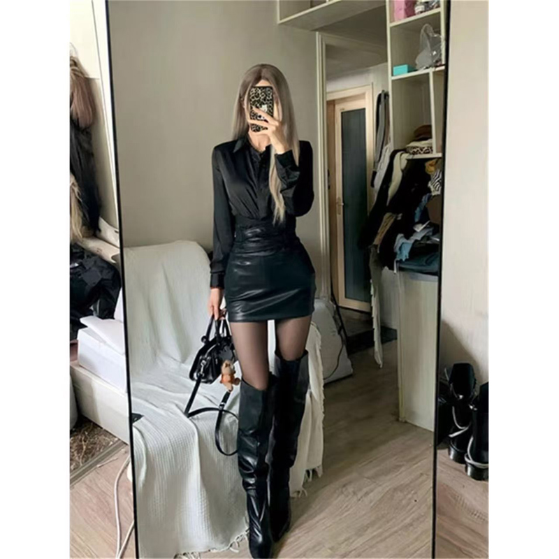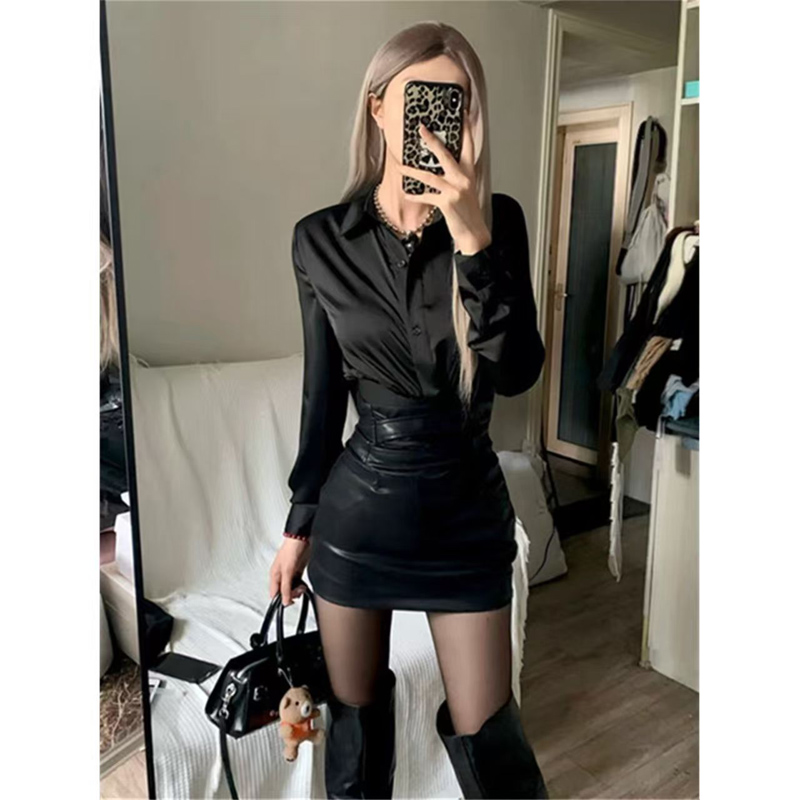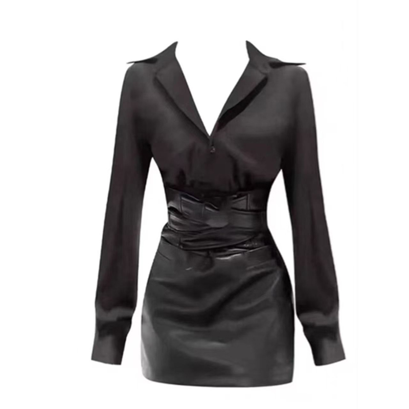 YF6151-图片色两件装韩版长袖翻领系扣宽松黑色衬衣配绑带收腰包臀套装新款