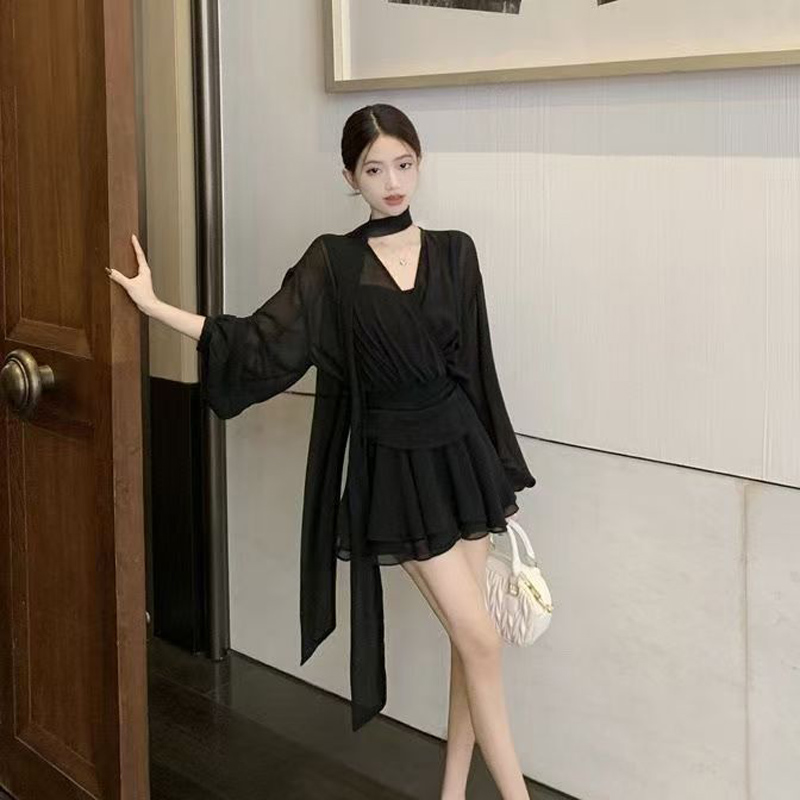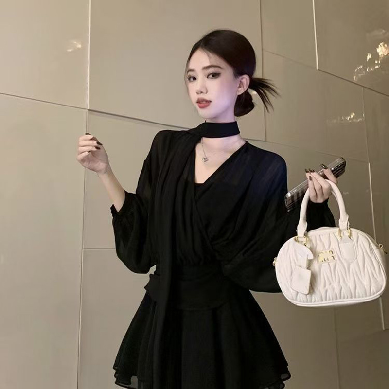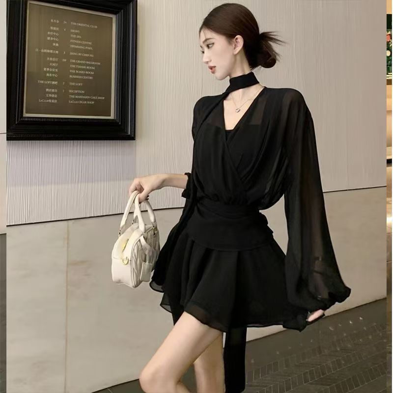YF6151-图片色两件装韩版长袖翻领系扣宽松黑色衬衣配绑带收腰包臀套装新款