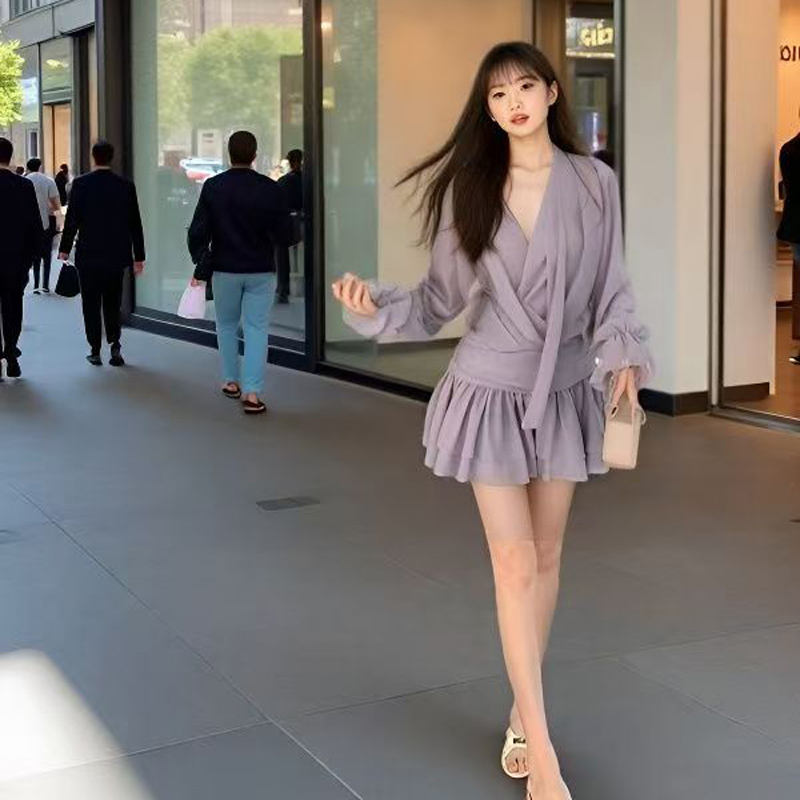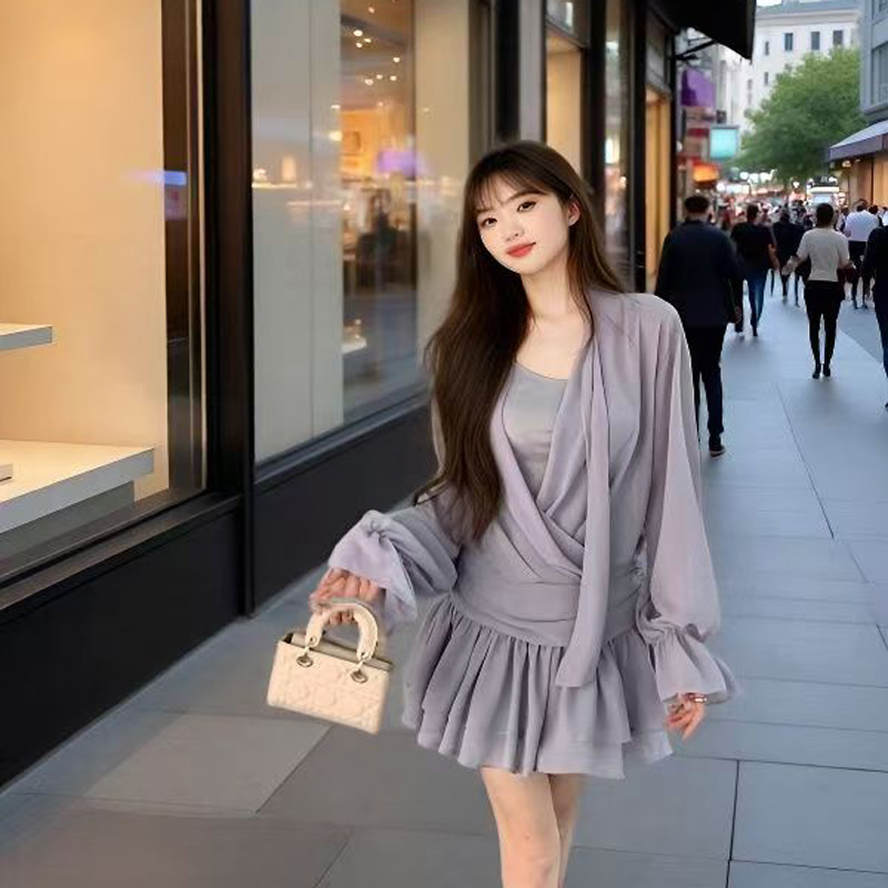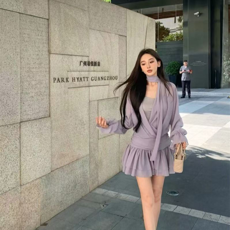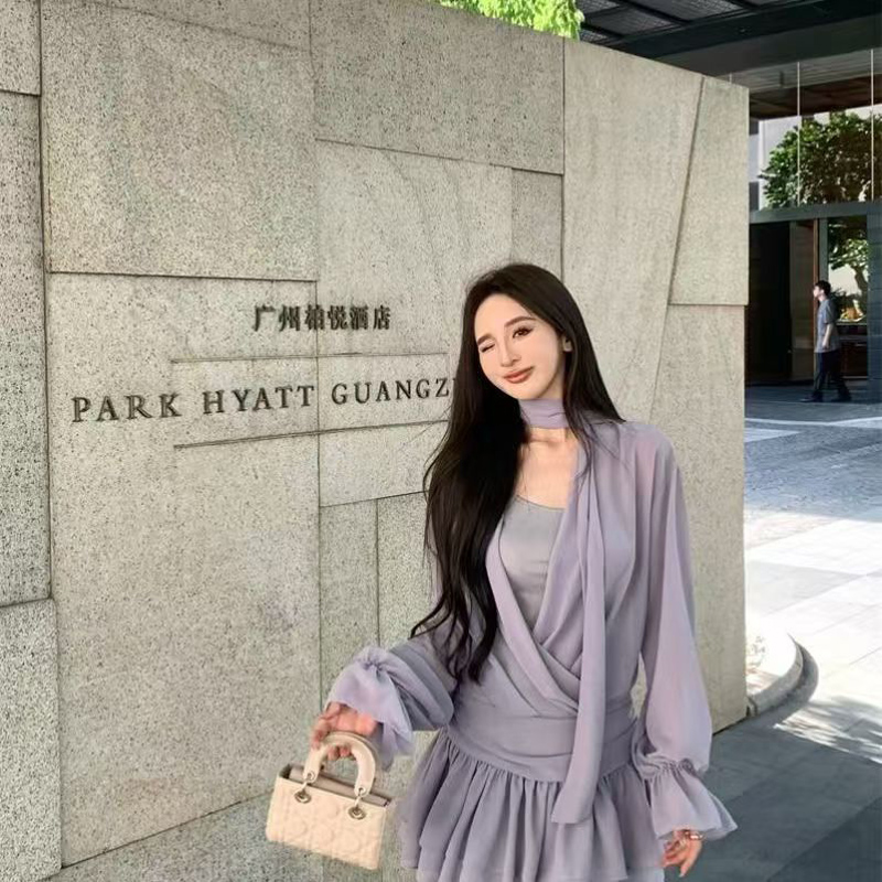 YF6156-(2色入内)优雅时尚木耳边长袖飘带围脖交叉褶折显瘦雪纺连衣