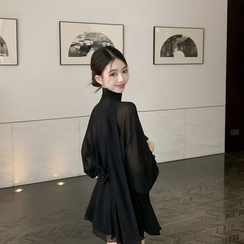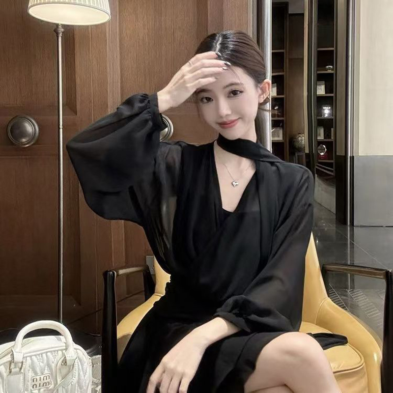 YF6156-(2色入内)优雅时尚木耳边长袖飘带围脖交叉褶折显瘦雪纺连衣裙