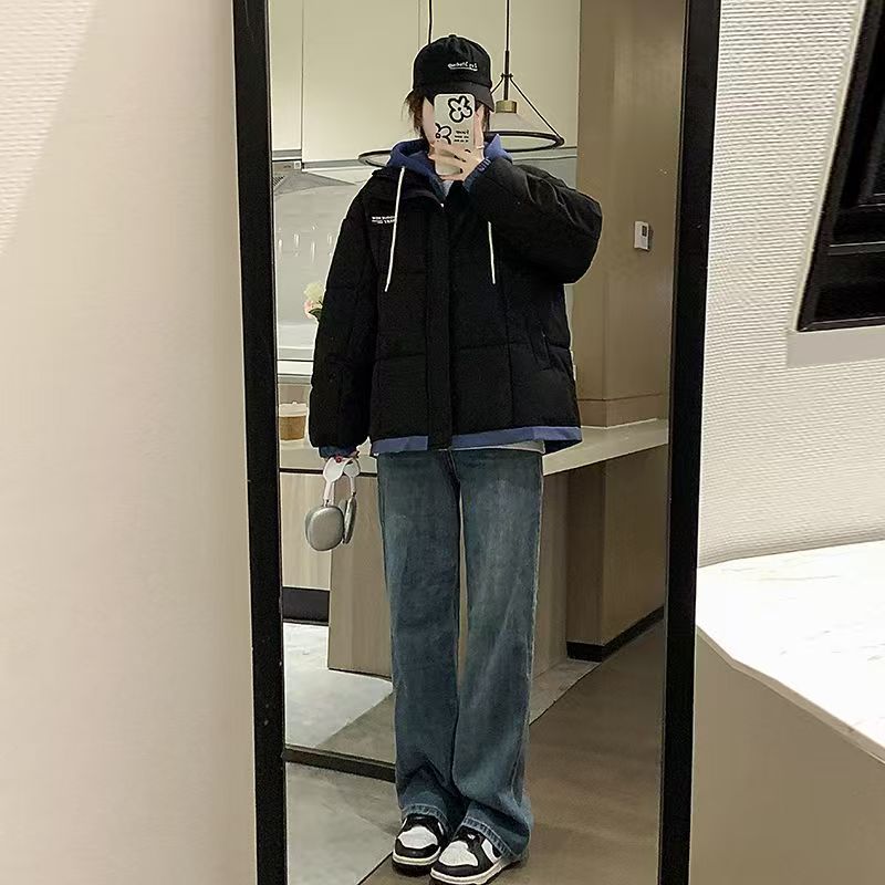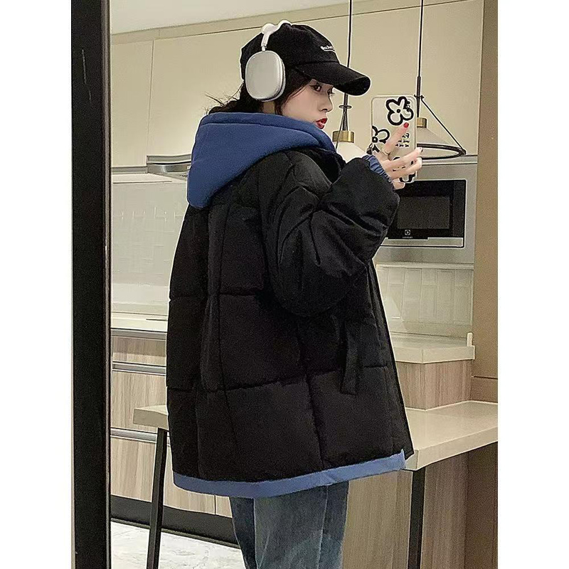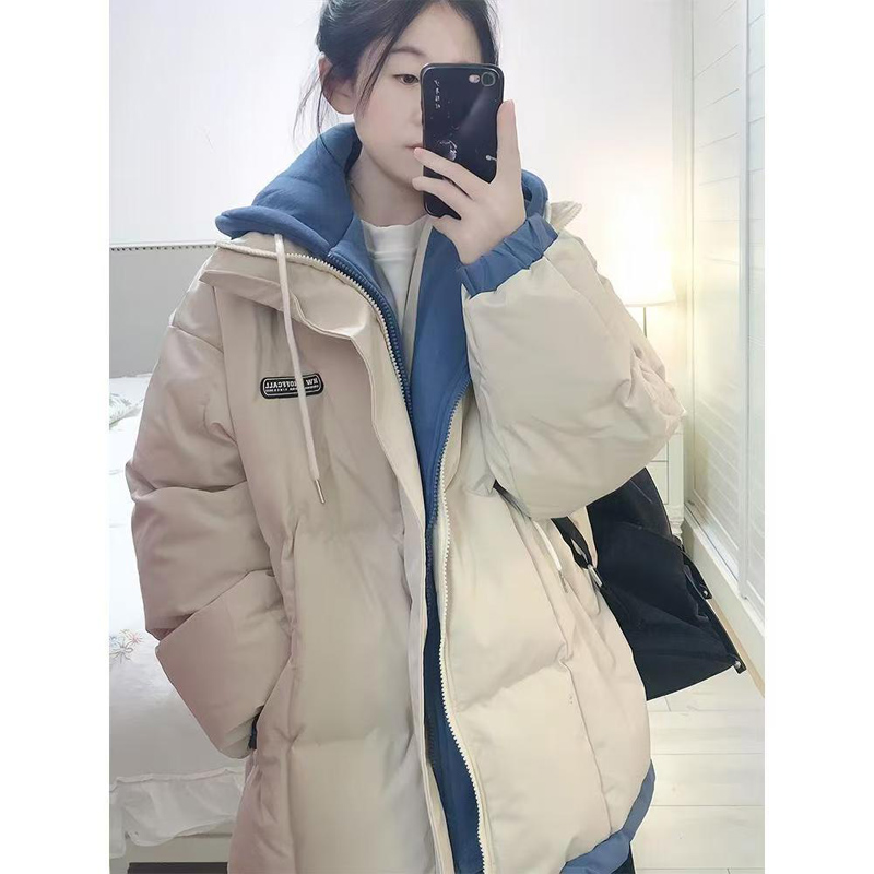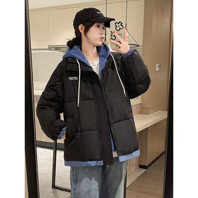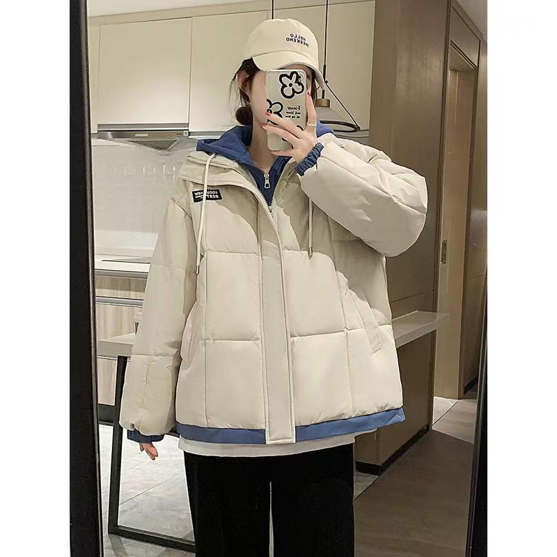 YF6161-(2色入内)假两件设计长袖连帽拉链加厚防风夹棉大码慵懒风羽绒服外套