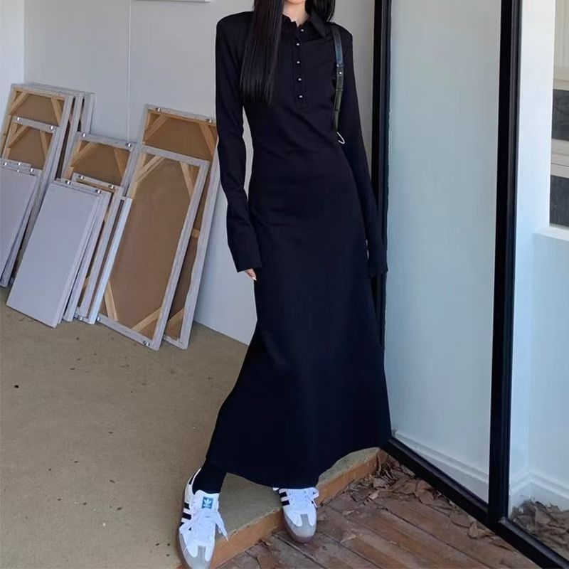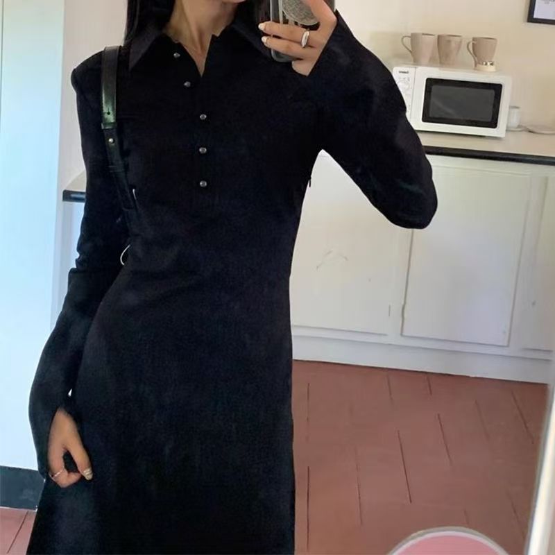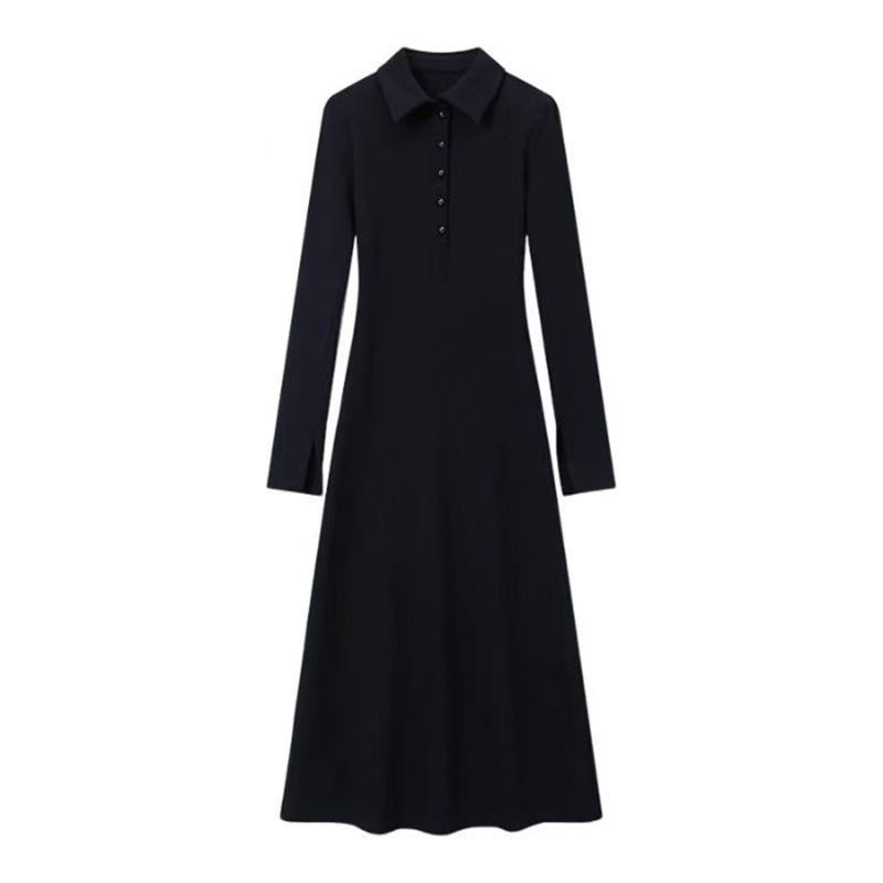 YF6167-图片色法式甜美时尚长袖POLO领排扣修腰包臀过膝别致感连衣