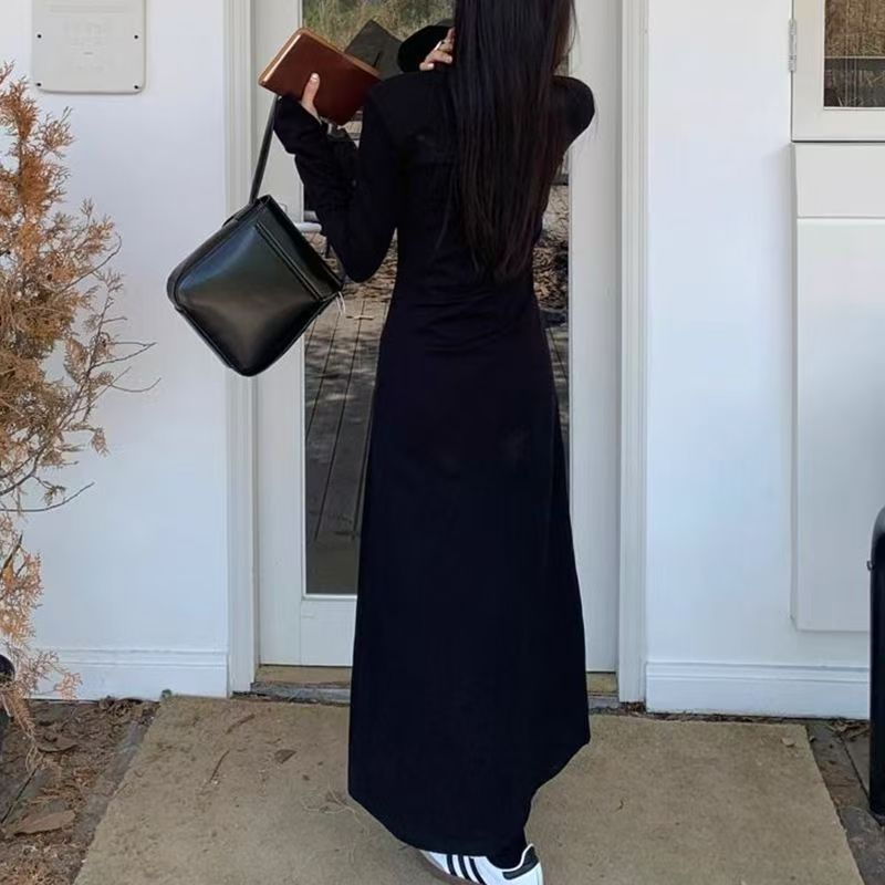 YF6166-图片色秋冬新款长袖深V扭纹修腰轻奢感显瘦黑色连衣裙