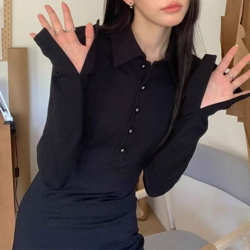YF6167-图片色法式甜美时尚长袖POLO领排扣修腰包臀过膝别致感连衣裙