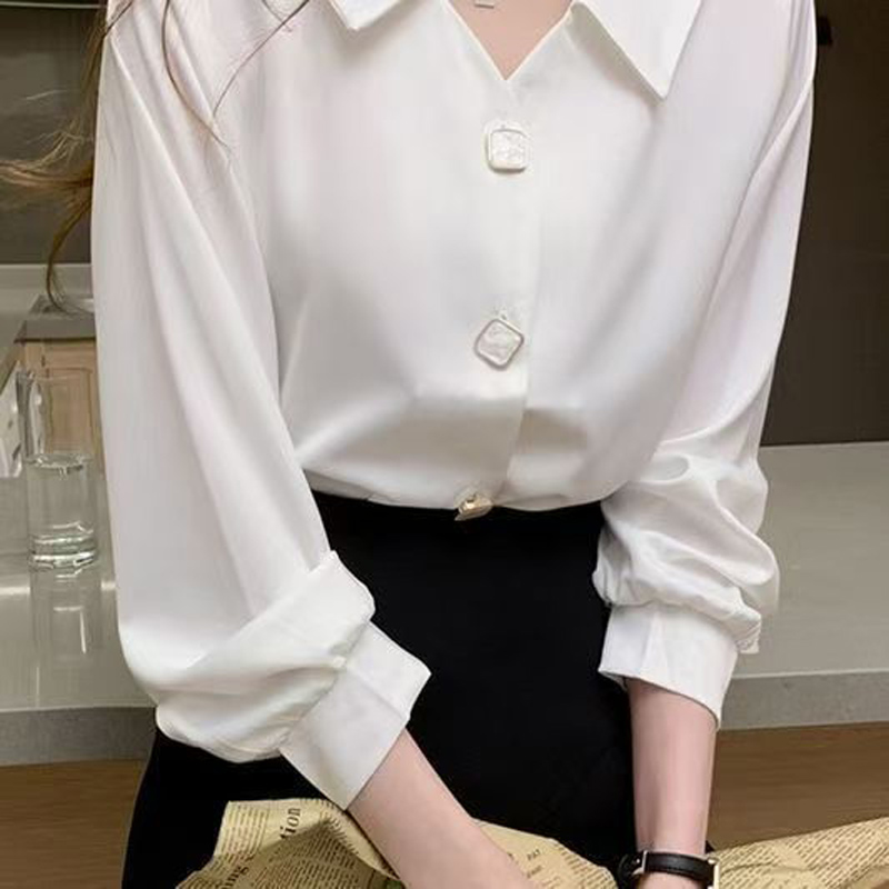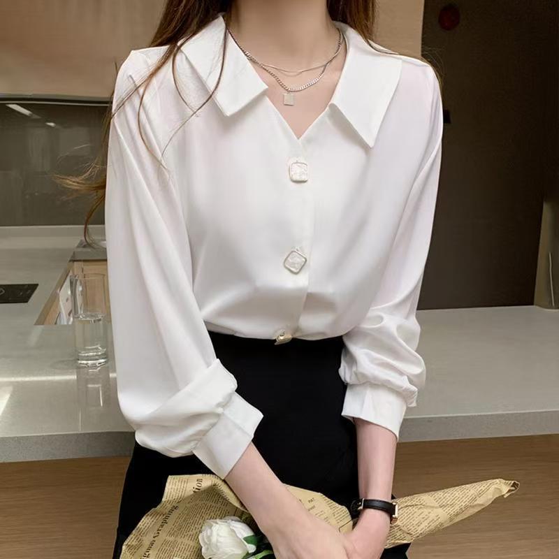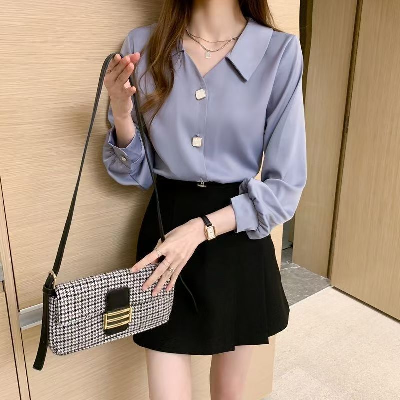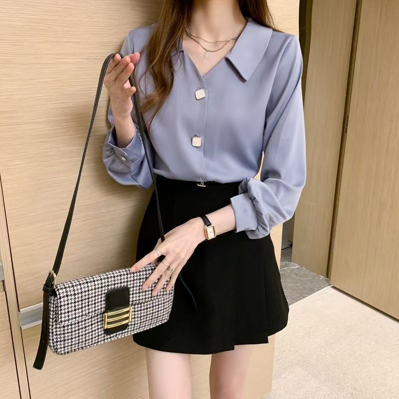 YF6182-(2色入内)甜美时尚丝滑面料长袖翻领个性方扣设计宽松大码衬衣
