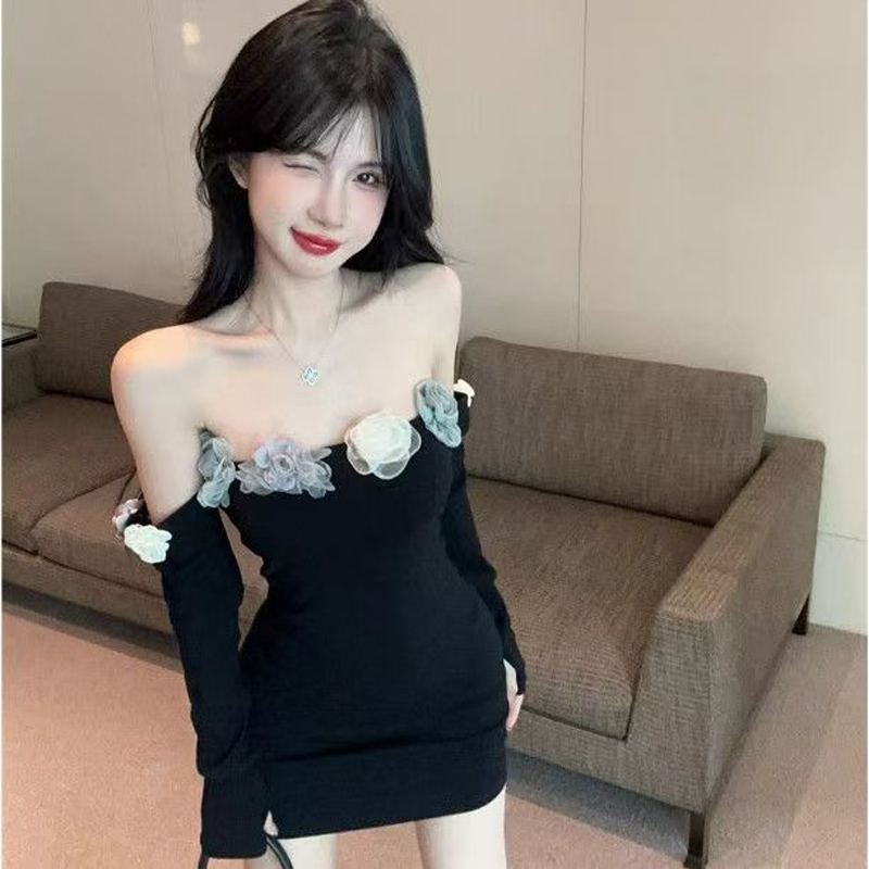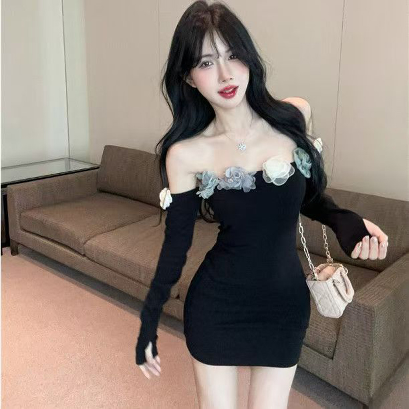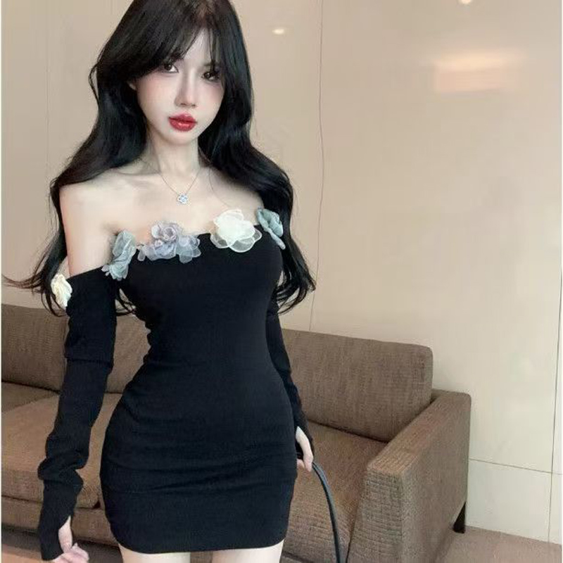 YF6184-图片色性感一字肩撞色玫瑰花设计感长袖弹力修腰包臀纯欲风小礼服