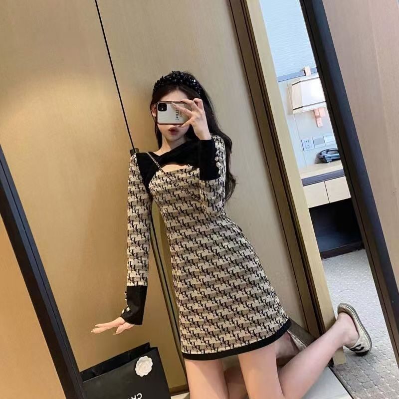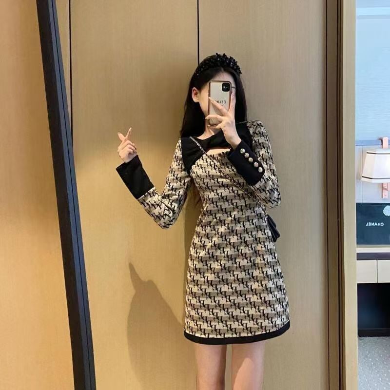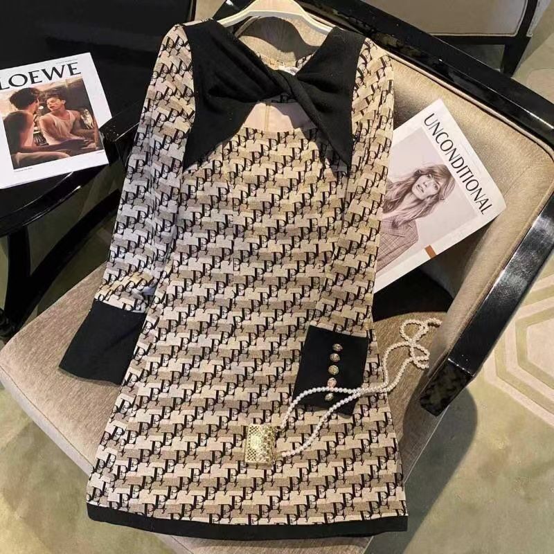 YF6185-图片色秋冬新款排扣长袖蝴蝶结镂空字母提花修身显瘦气质针织裙
