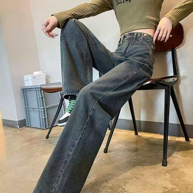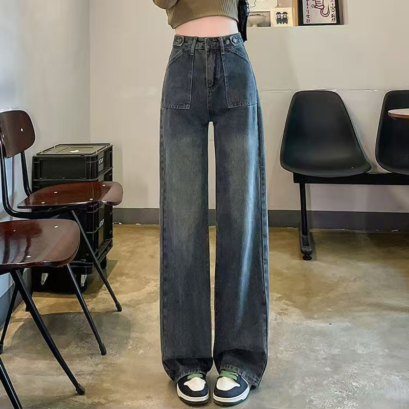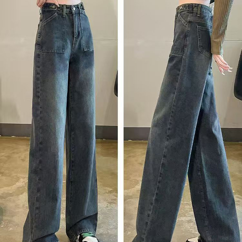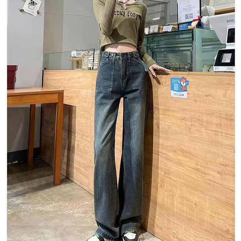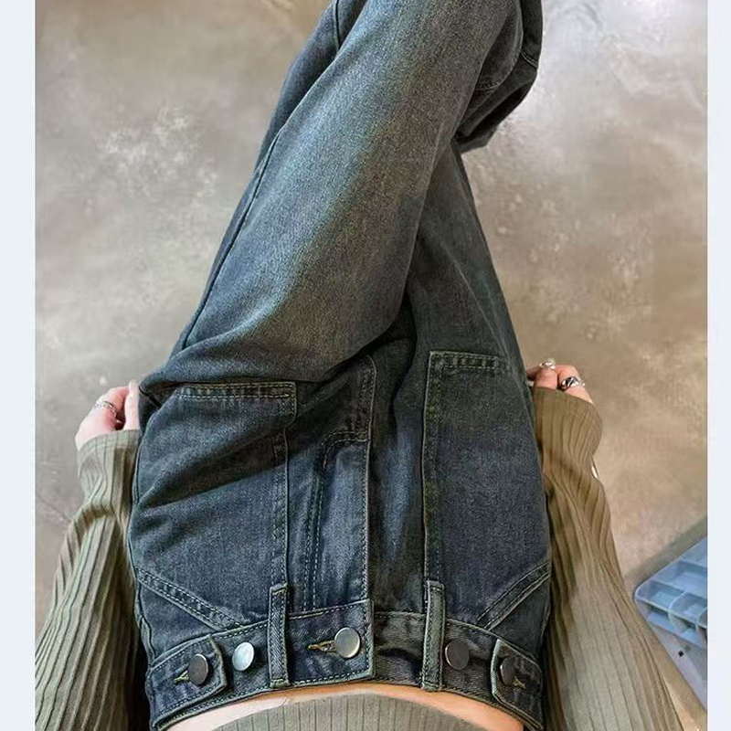YF6187-图片色港式可调高腰直筒复古外露口袋设计感坠地慵懒风牛仔裤