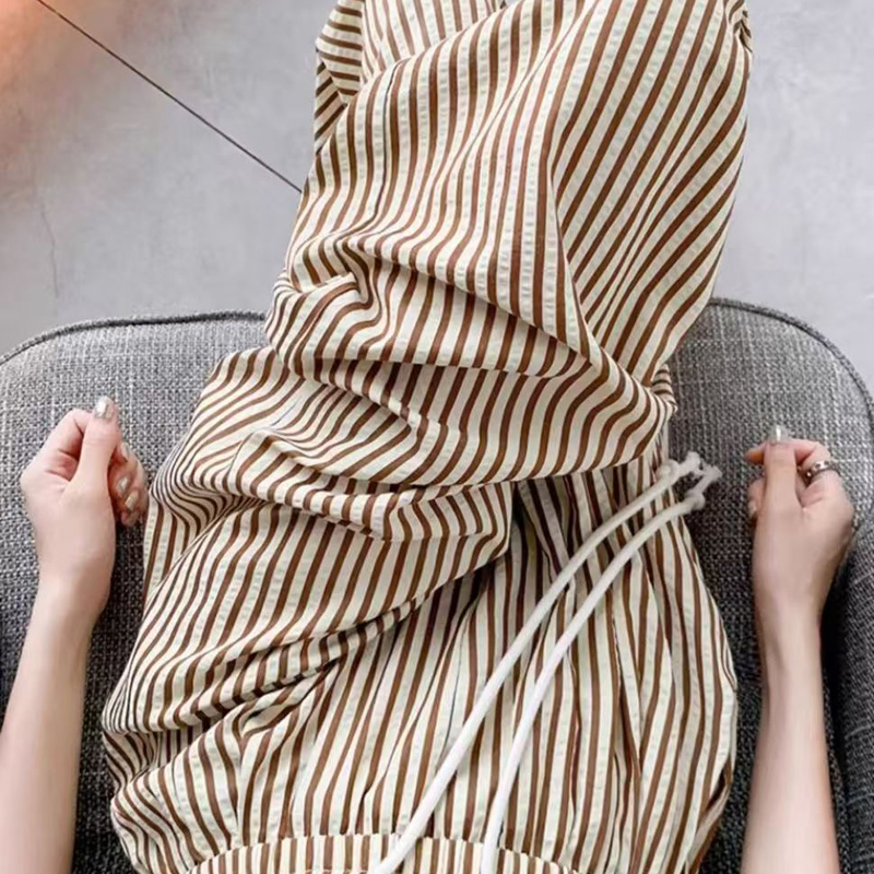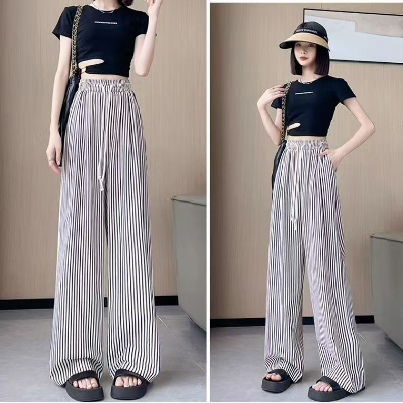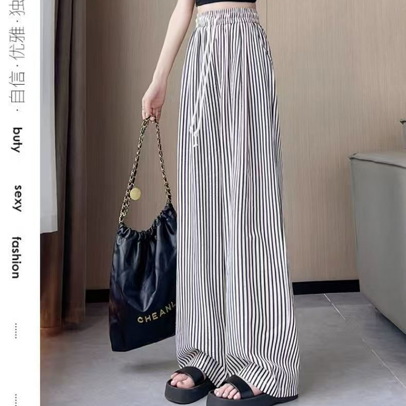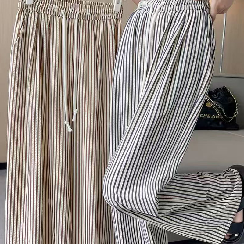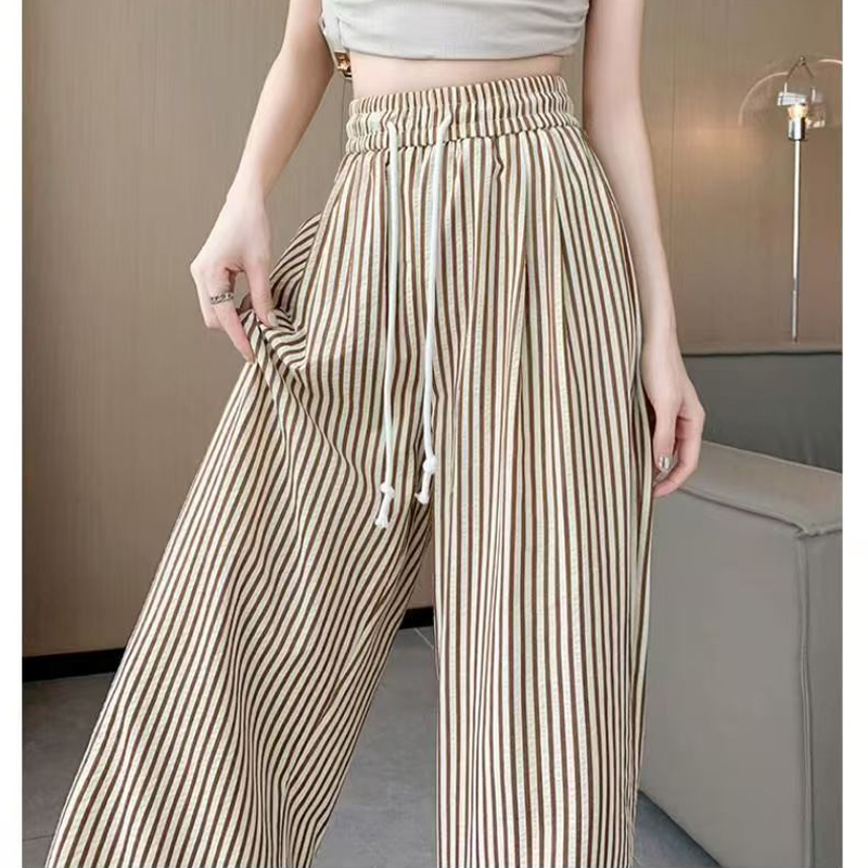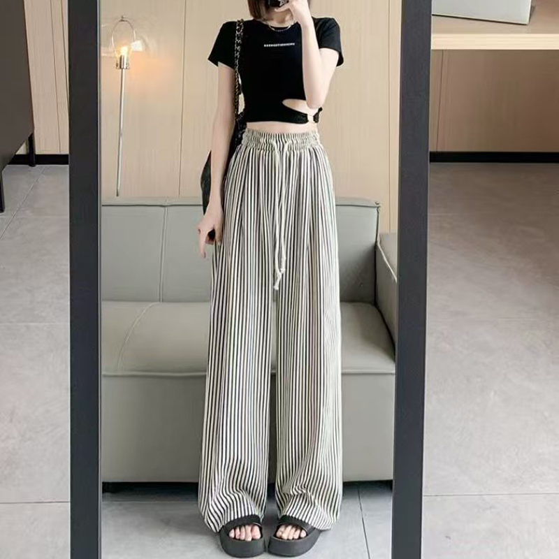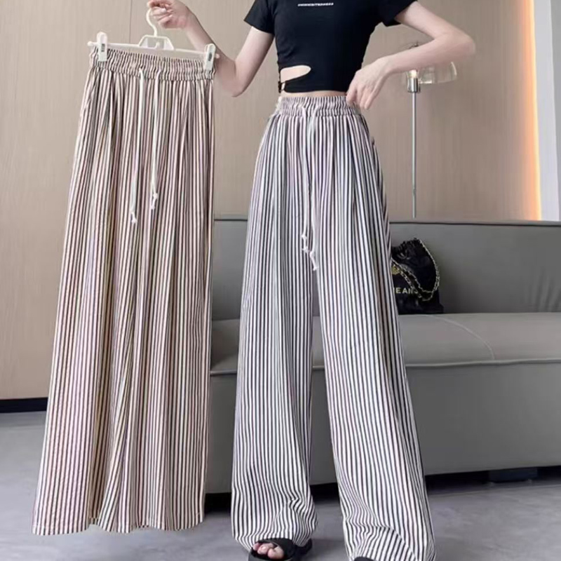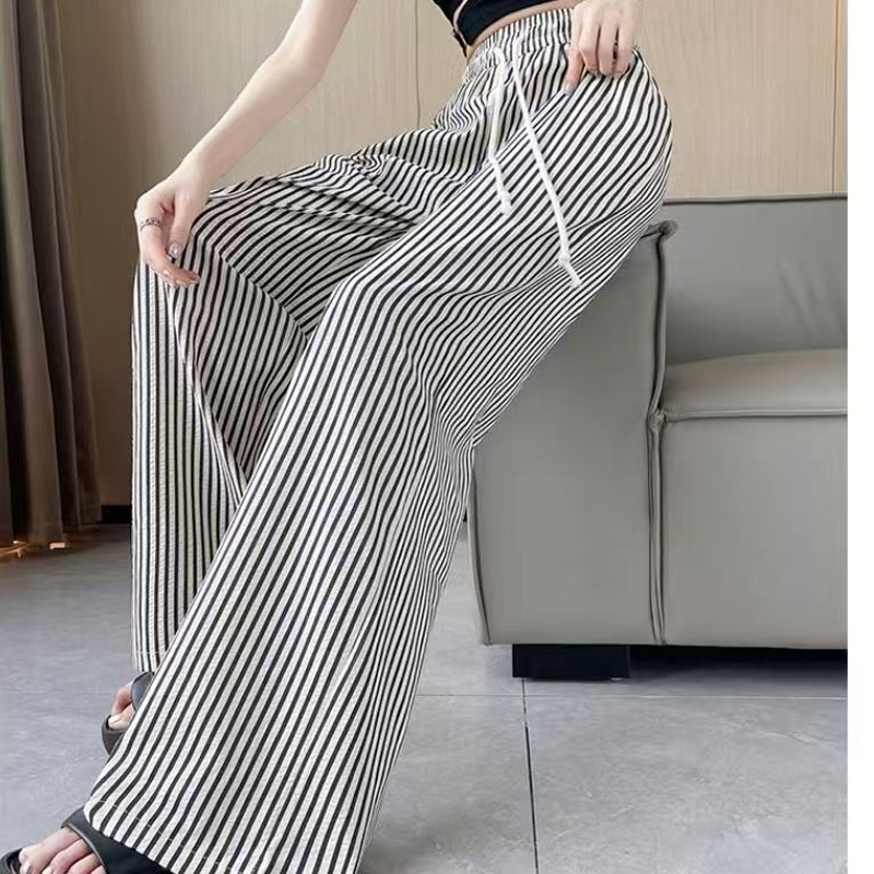 YF6188-(3色入内)港式细条纹抽绳松紧腰直筒坠地感阔脚休闲百搭长裤