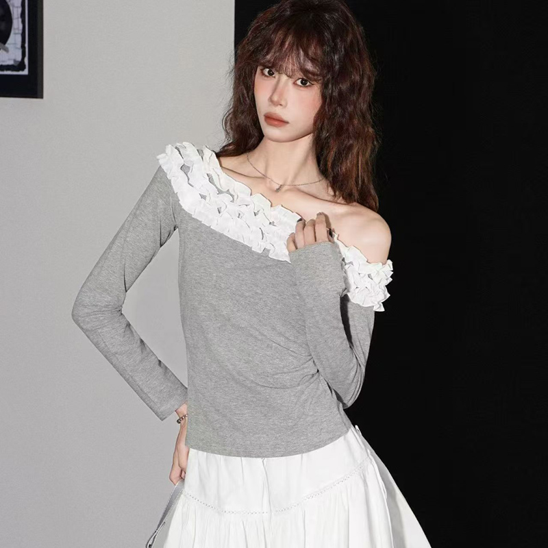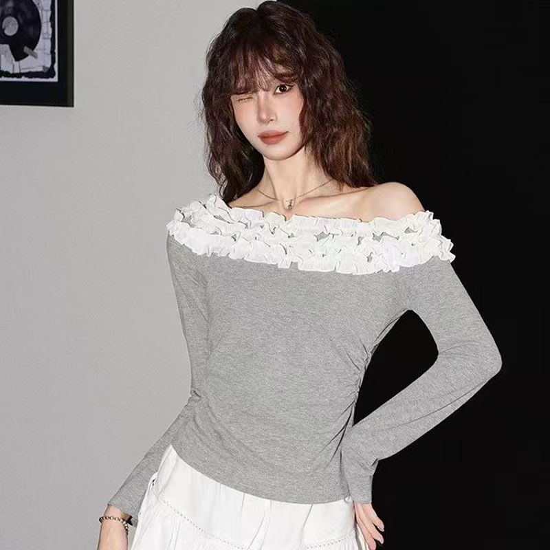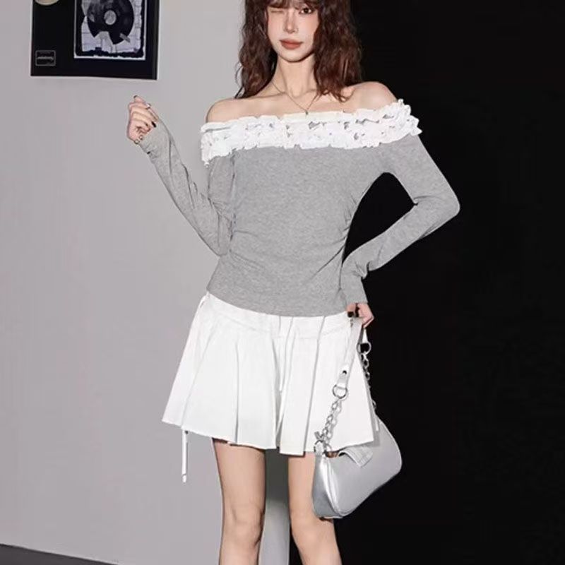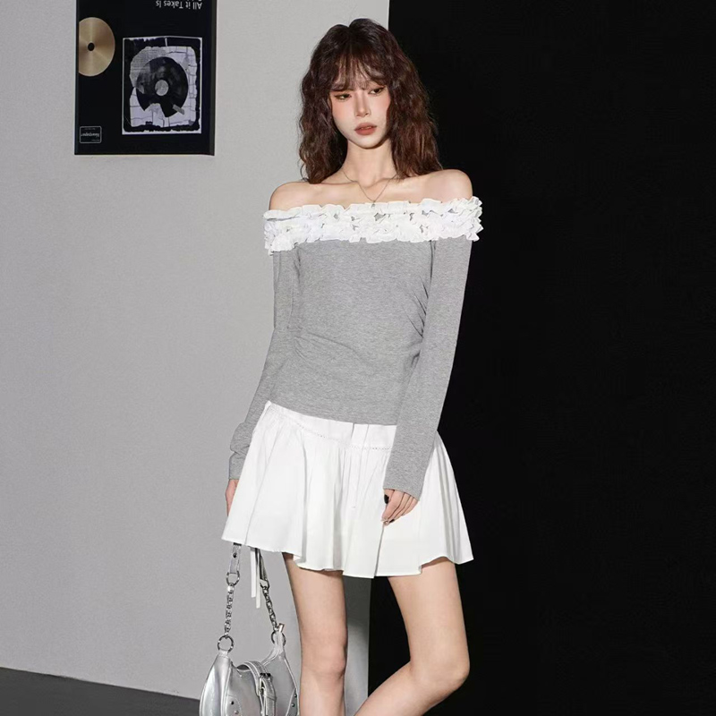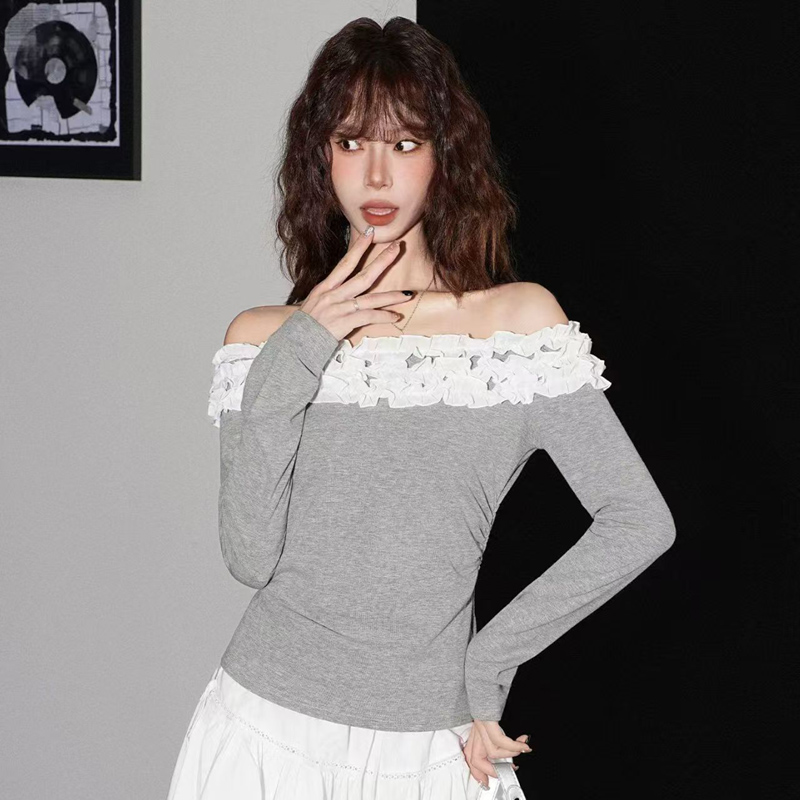 YF6195-图片色一字肩碎花设计长袖修腰拼接洋气纯欲女辣妹新款春秋上衣