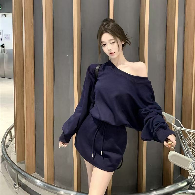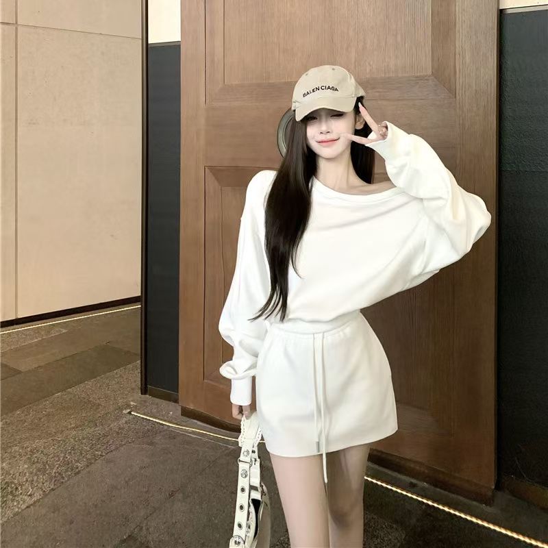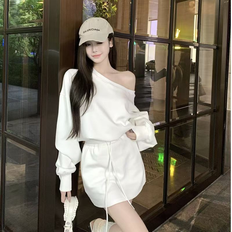 YF6196-(2色入内)两件套露肩长袖宽松大码卫衣配松紧腰绑绳休闲百搭套装