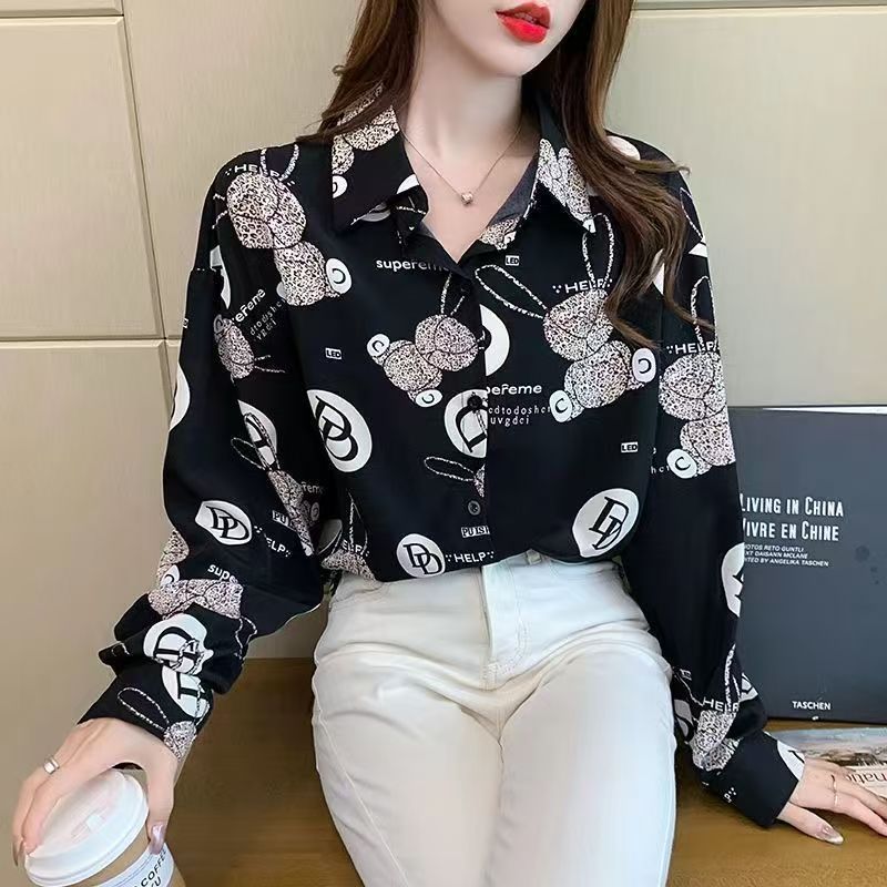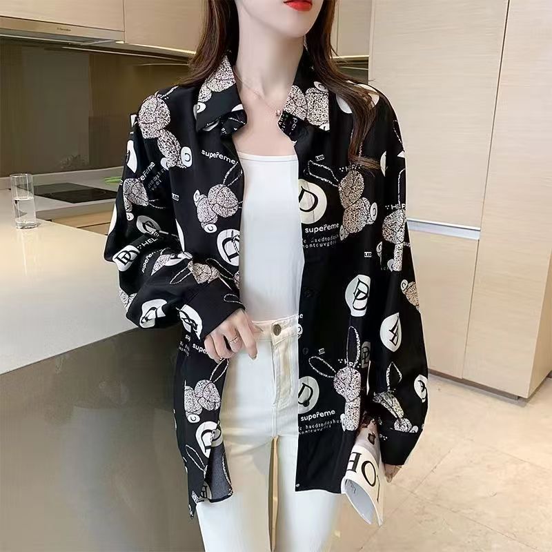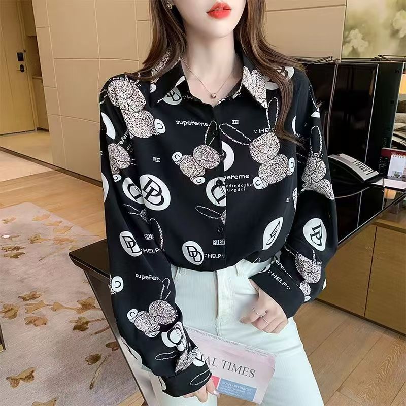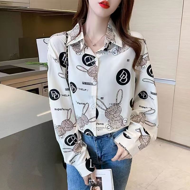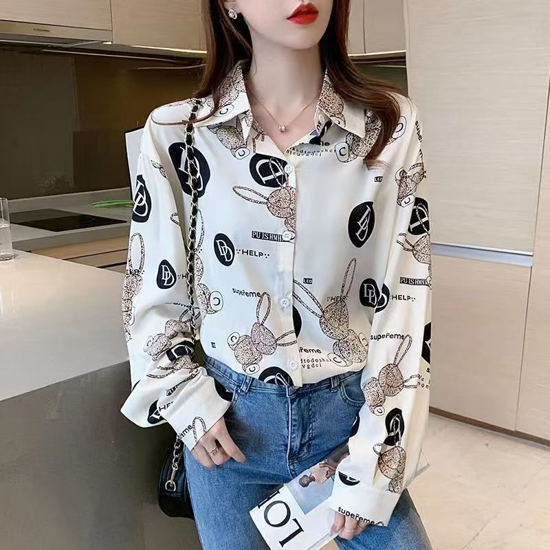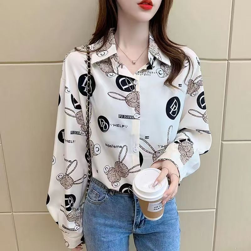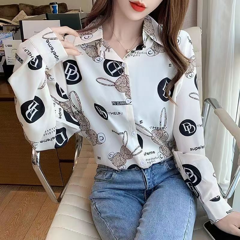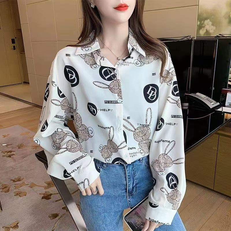 YF6203-(2色入内)慵懒风小心机D字母兔兔卡通印花设计长袖反领春秋新款衬衣