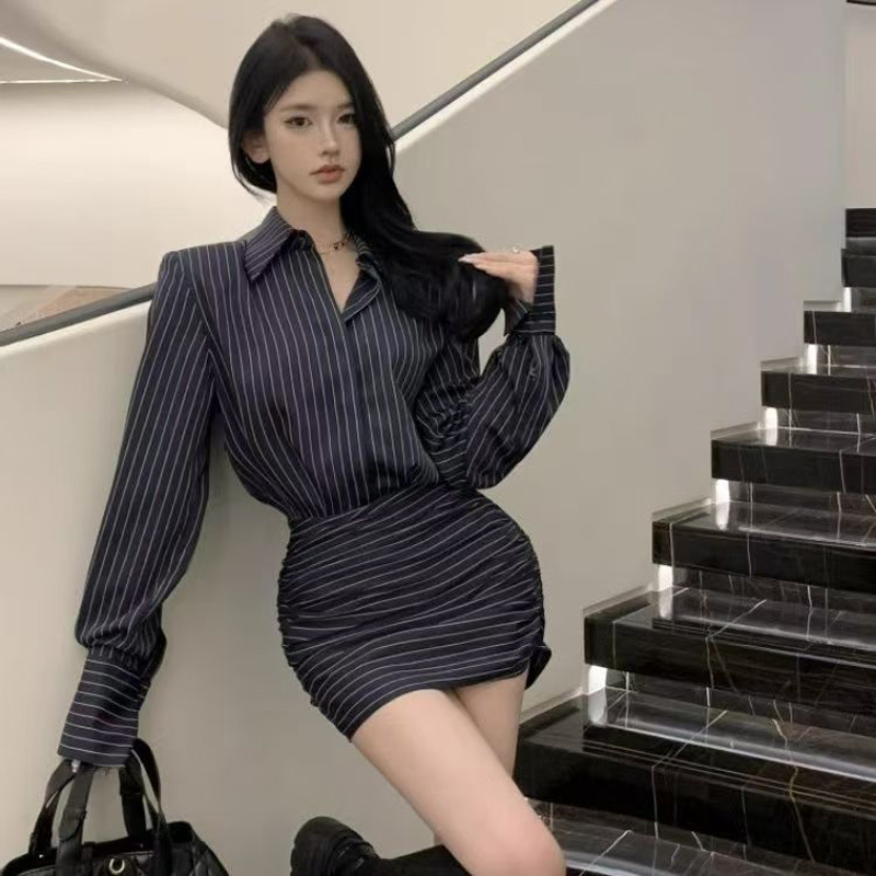 YF6205-图片色韩版长袖翻领条纹拼接包臀慵懒风宽松大码个性设计连衣裙