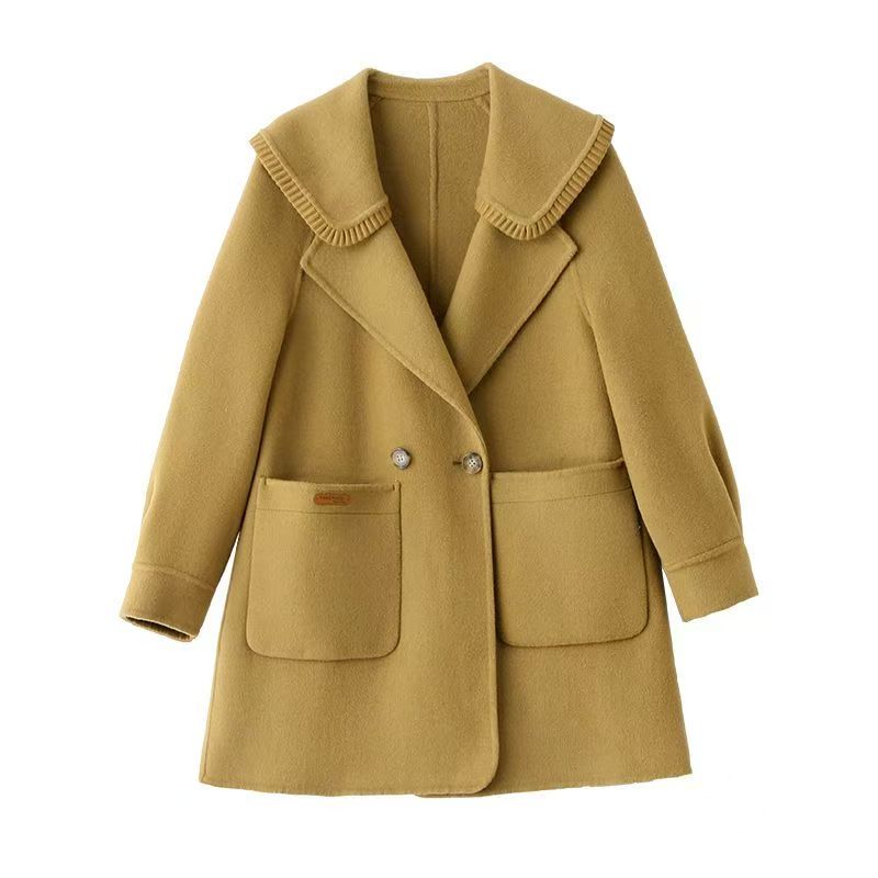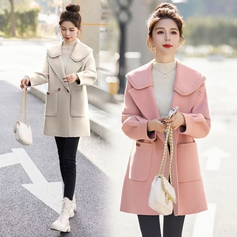 YF6207-(4色入内)甜美冬季娃娃领长袖排扣宽松大码宽松显瘦加厚毛呢外套