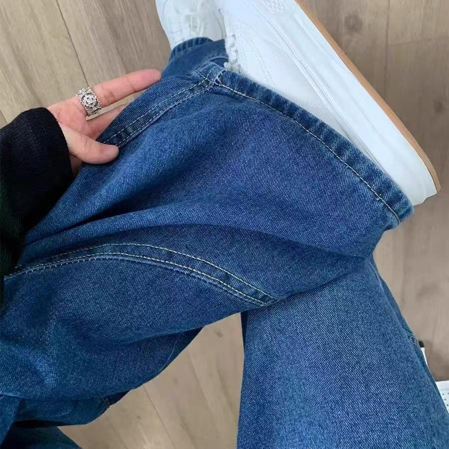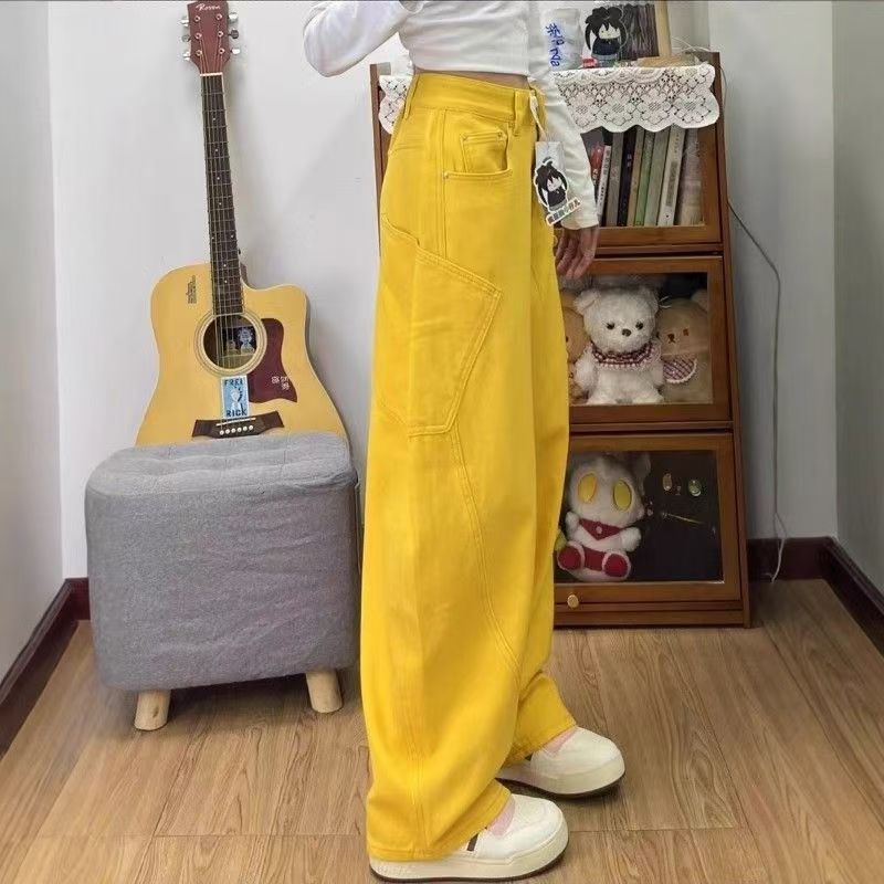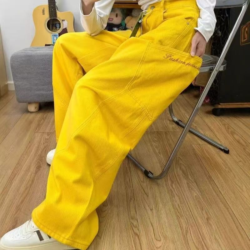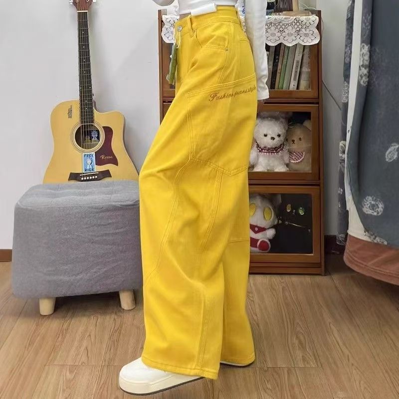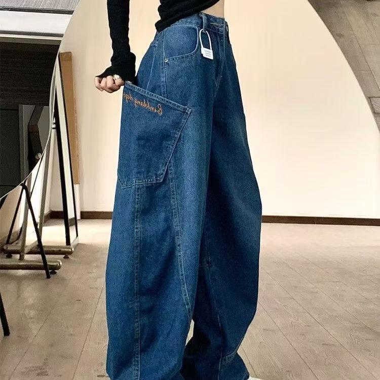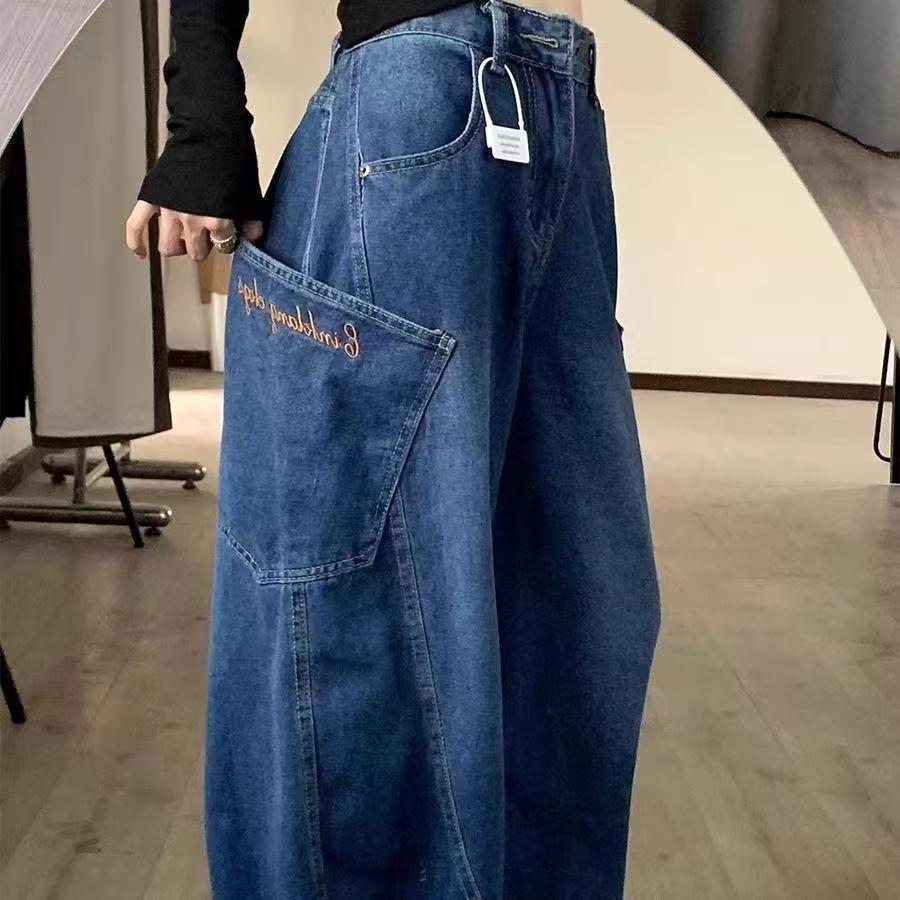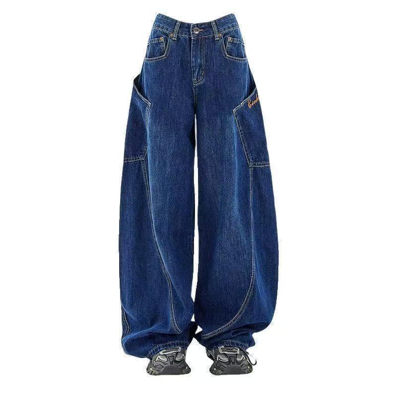 YF6209-(2色入内)字母刺绣弯刀拼接系扣高腰阔腿慵懒风复古蓝休闲牛仔裤