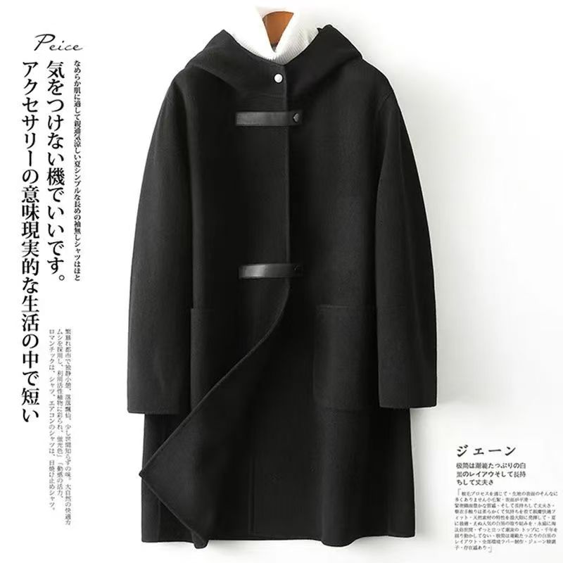 YF6210-(3色入内)韩版毛呢大衣 长袖连帽加绒系扣中长款大码双面呢风衣