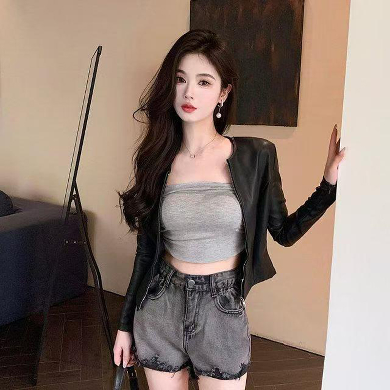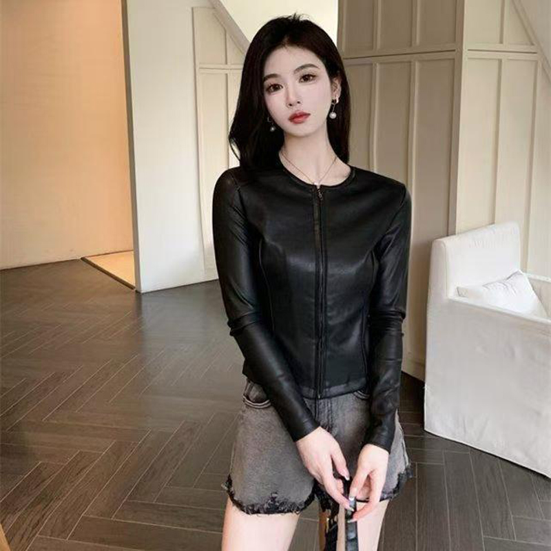 YF6211-图片色机车美少女短款长袖拉链收腰短款辣妹冬装仿皮PU皮衣上衣