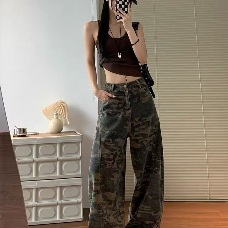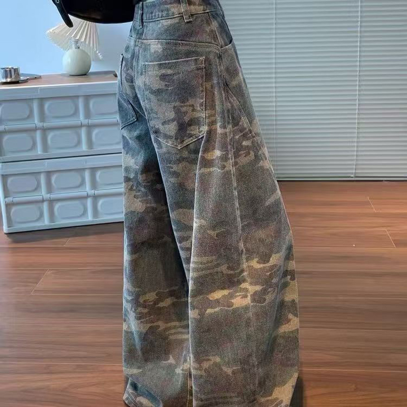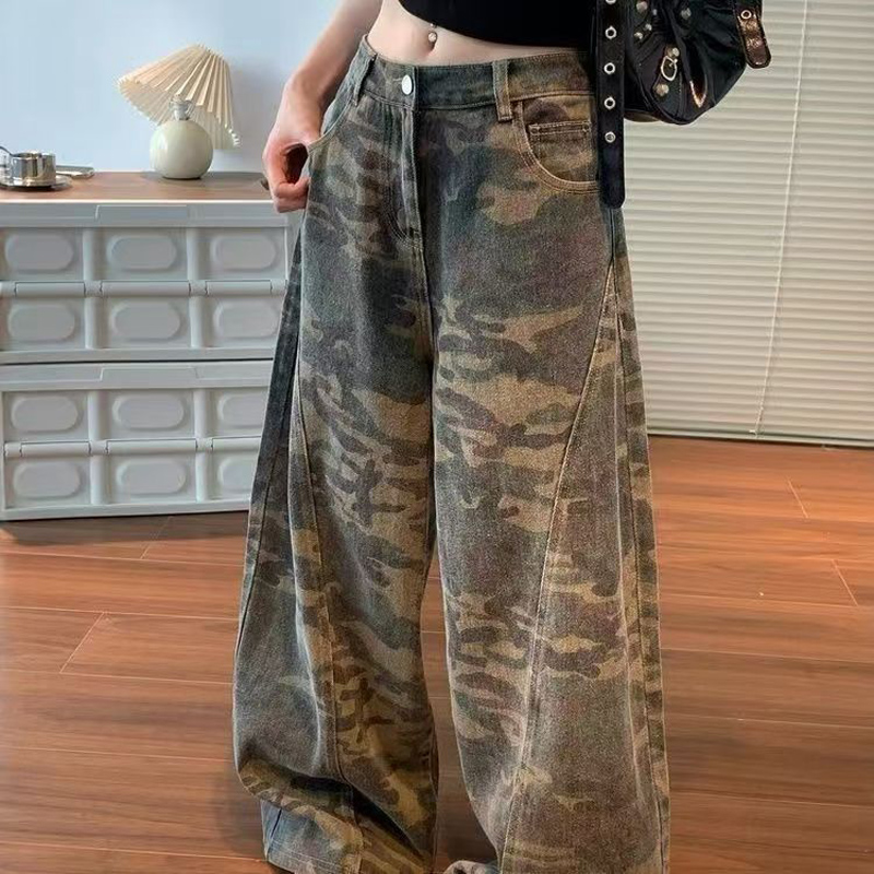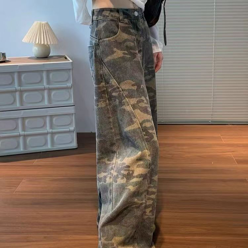 YF6215-图片色弯刀拼接设计慵懒风系扣高腰阔腿迷彩小众潮爆牛仔裤