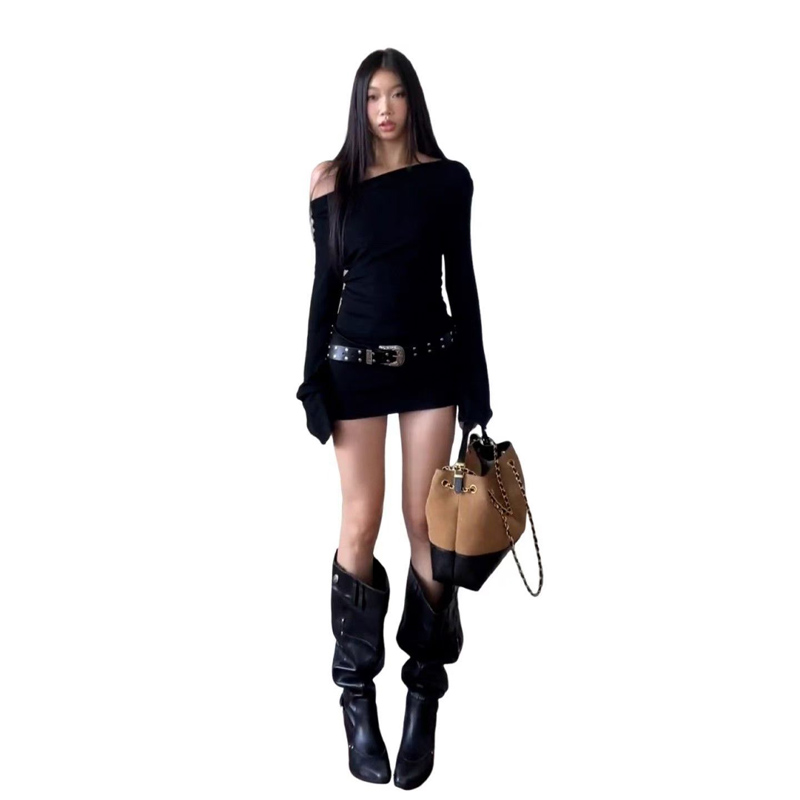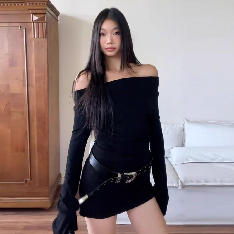 YF6216-图片色秋冬一字肩辣妹新款长袖系腰夜店风性感防走内搭黑色气质连衣