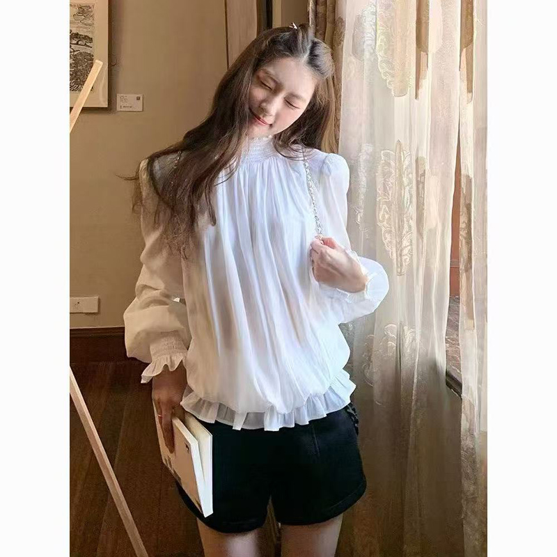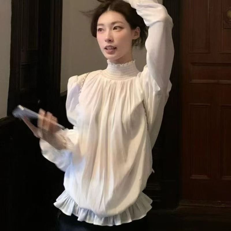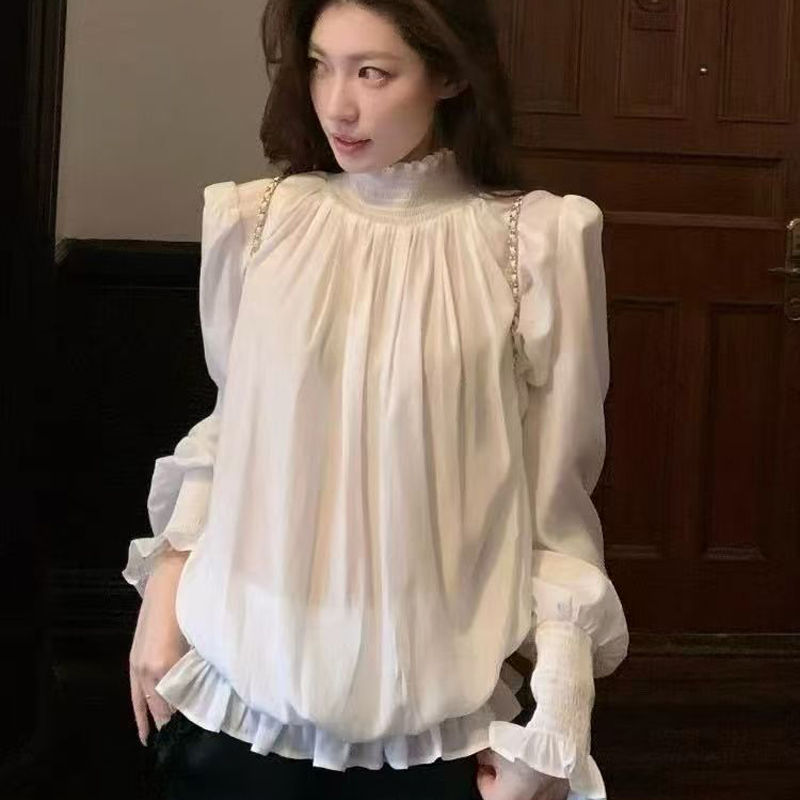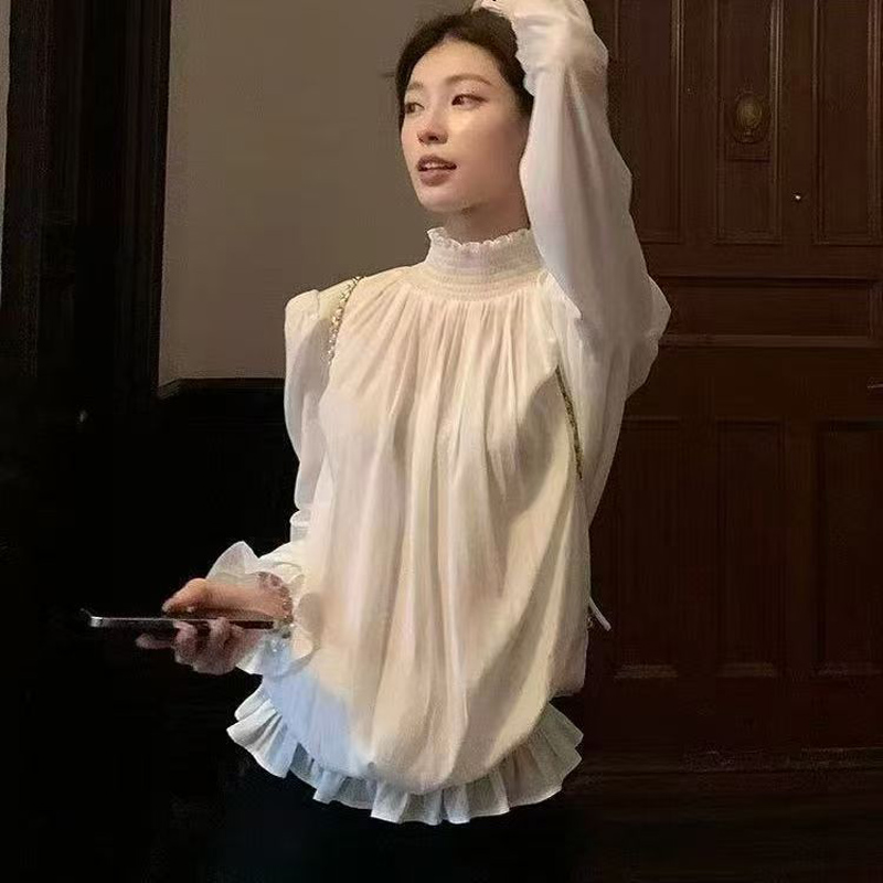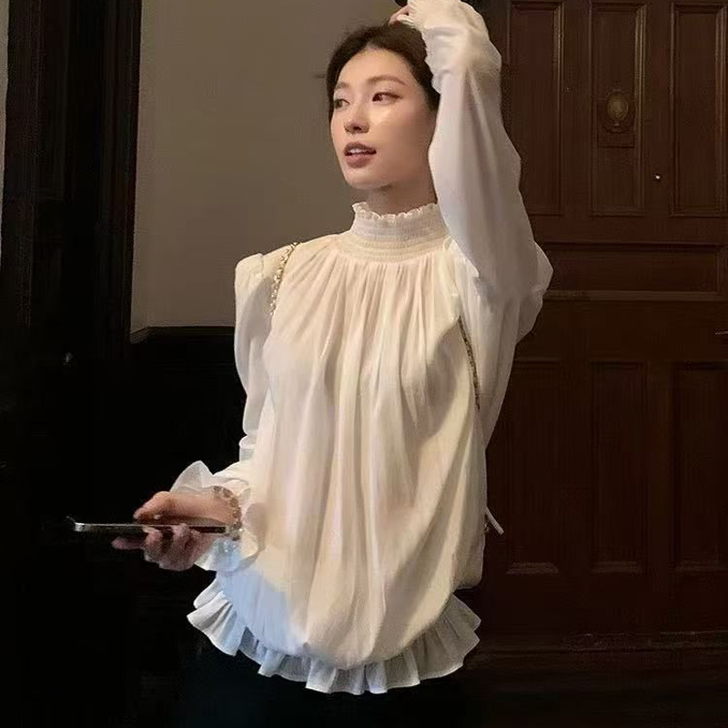 YF6217-图片色小香风复古长袖半高领花边褶折法式公主美式高级感雪纺衫