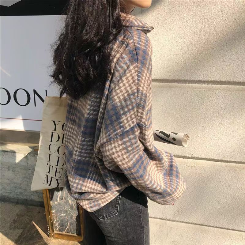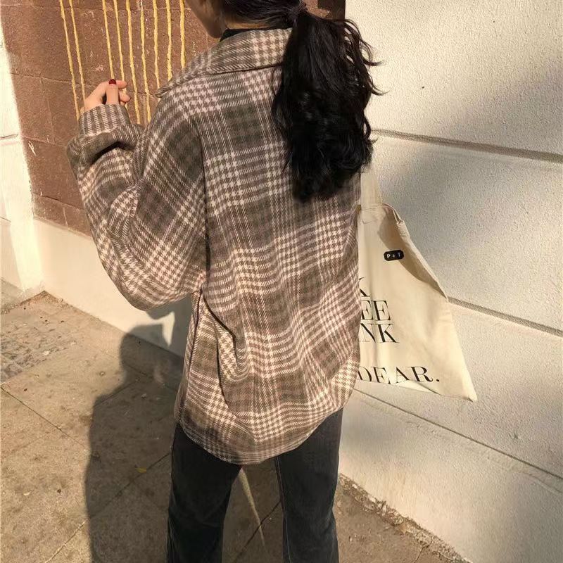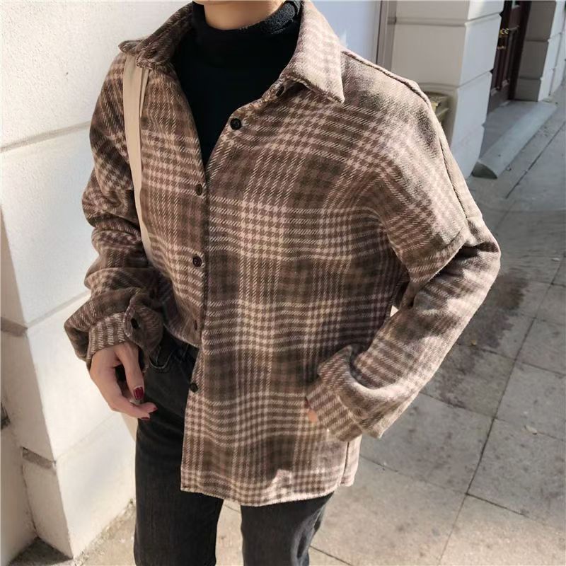 YF6221-(2色入内)港味春秋百搭复古格子长袖翻领宽松显瘦大码磨毛衬衣