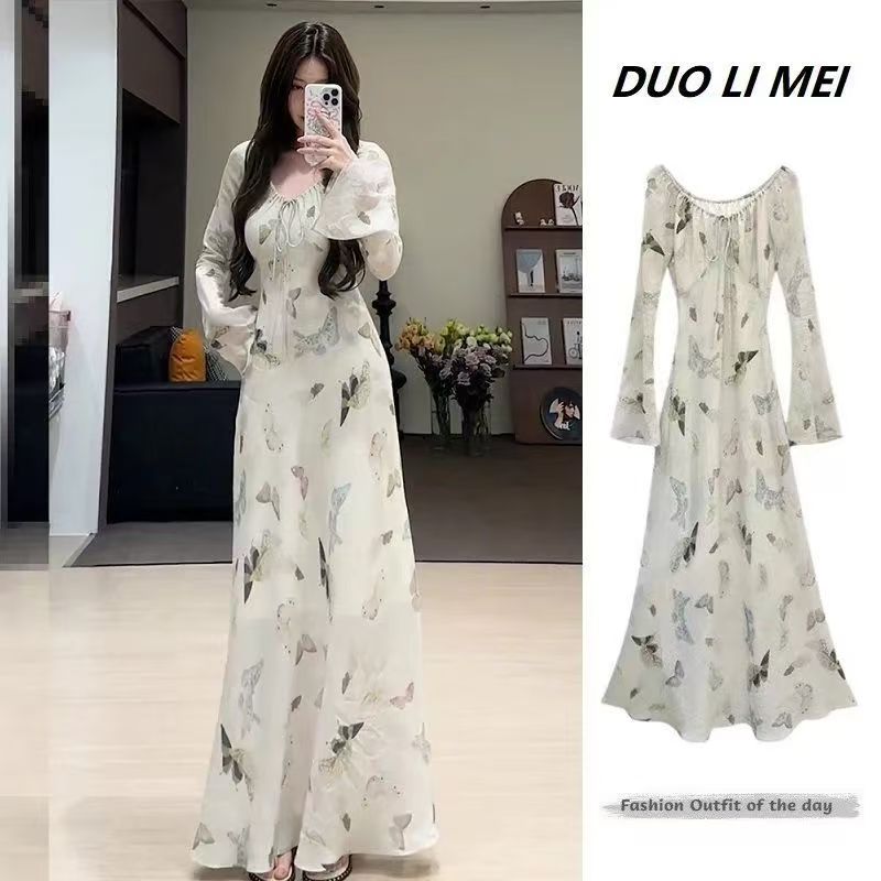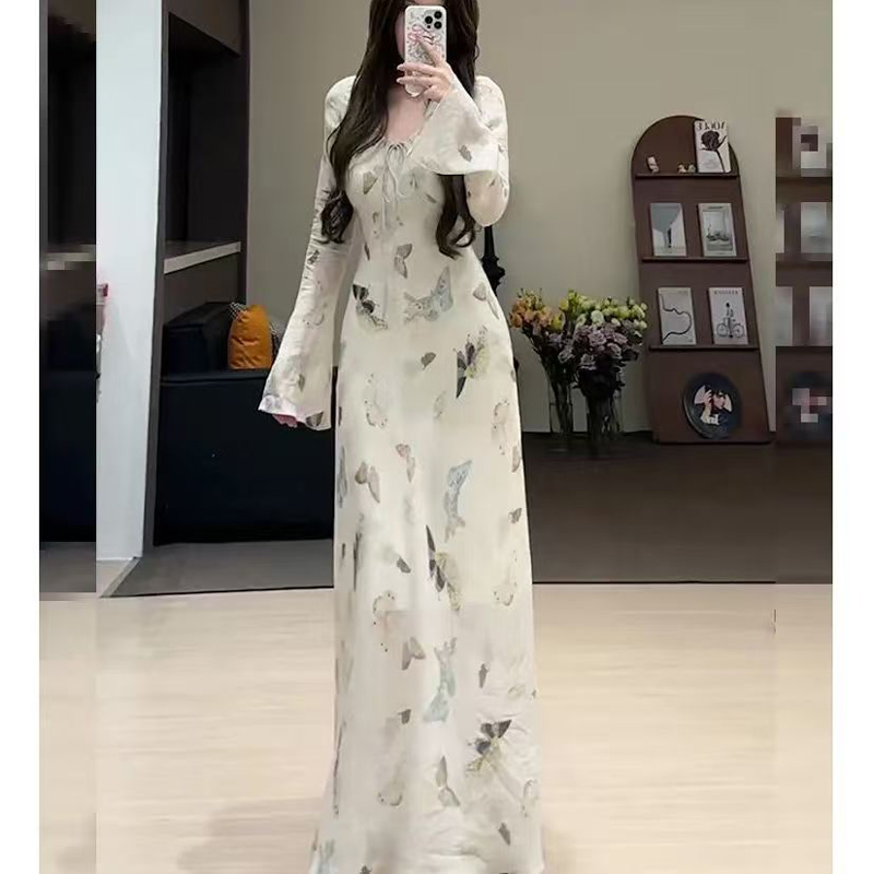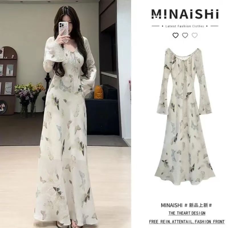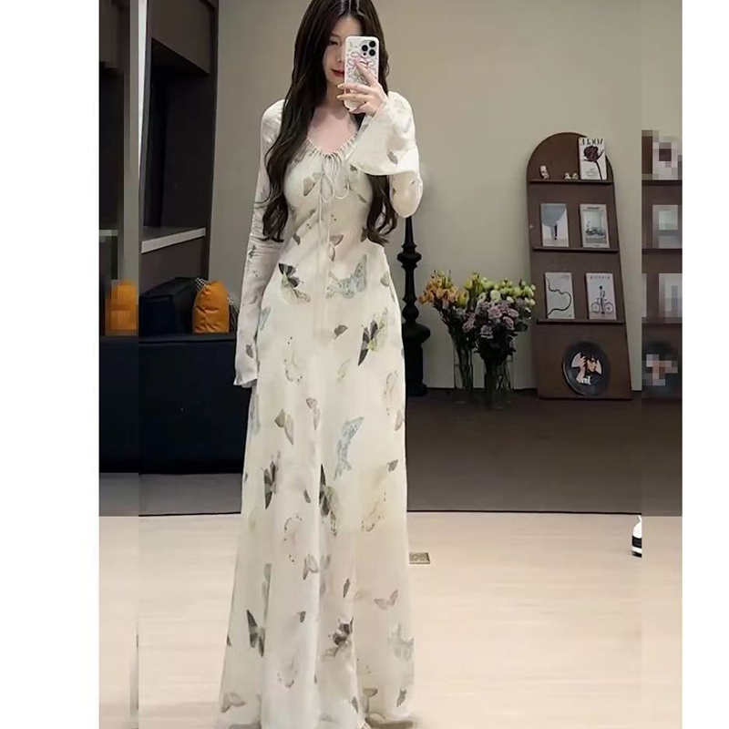 YF6222-图片色甜美时尚微喇叭长袖系绳修腰蝴蝶印花ins时尚雪纺连衣裙