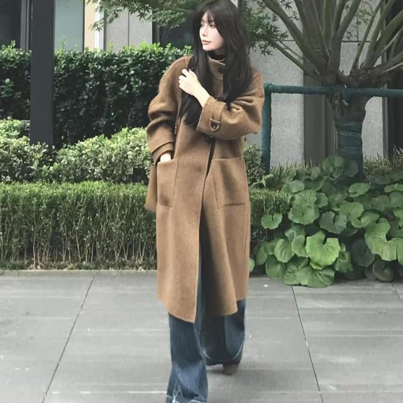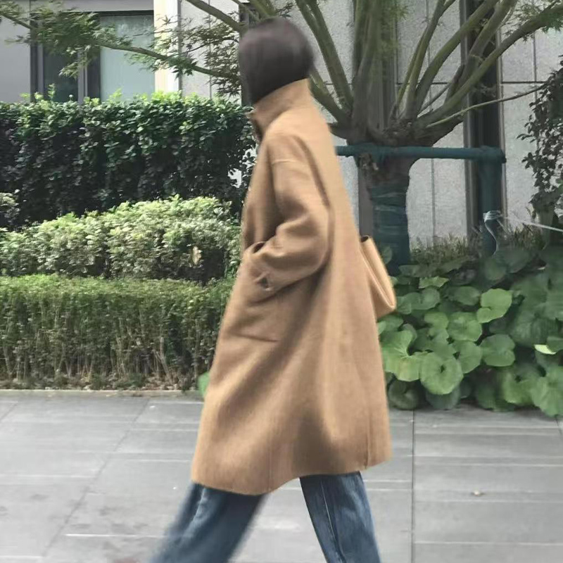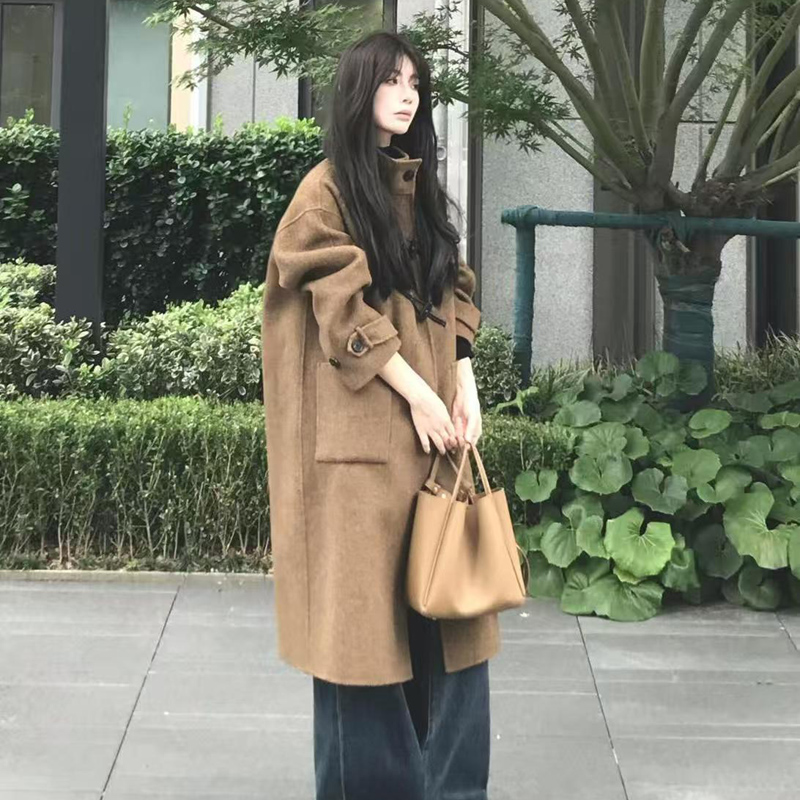 YF6226-图片色韩版冬装长袖立领牛角扣立领中长款驼色加厚毛呢大衣外套