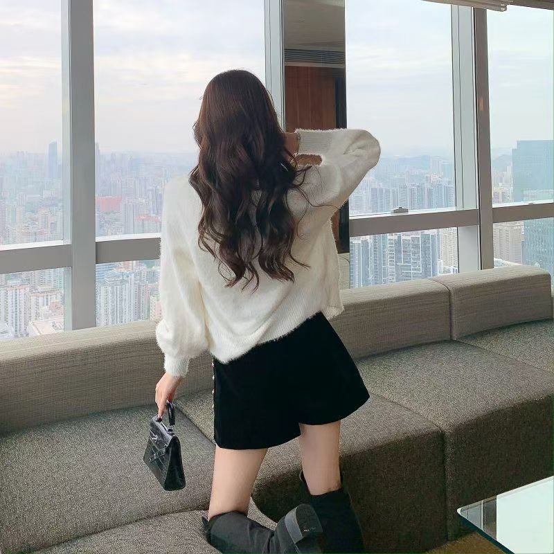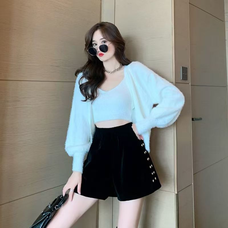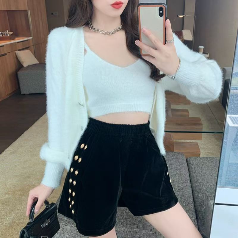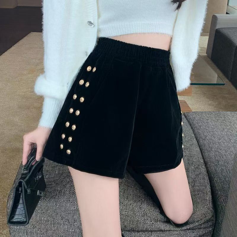 YF6228-图片色冬季时尚保暖金丝绒侧铆钉排扣收腹高腰A字阔腿短裤