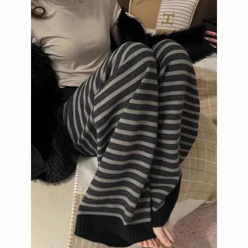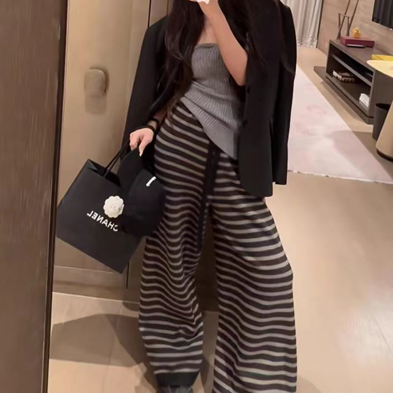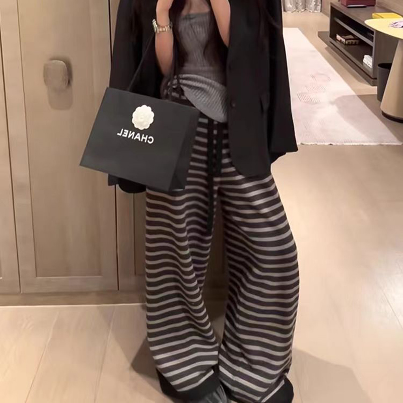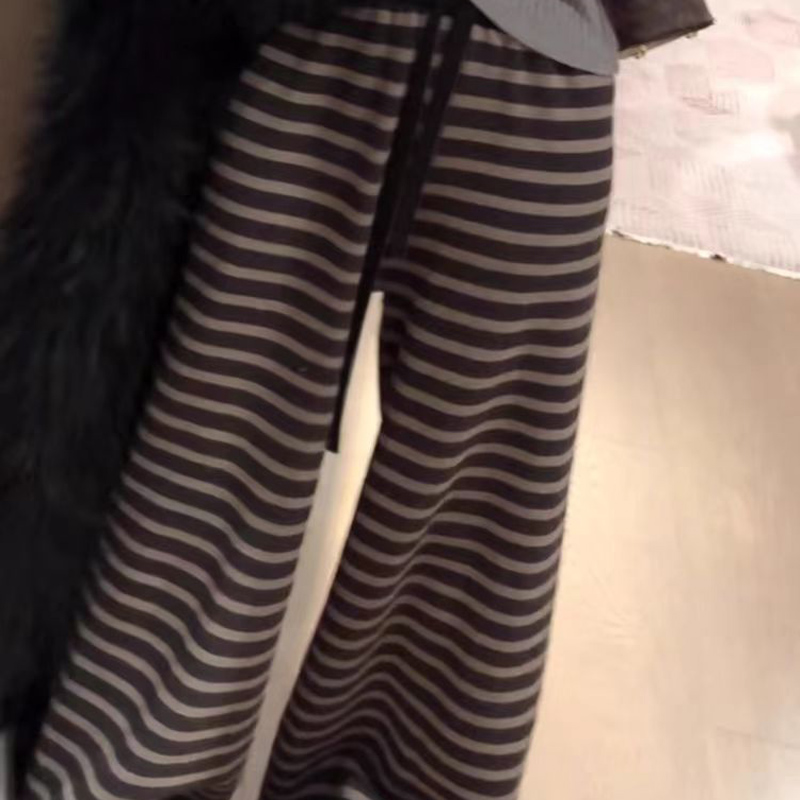YF6239-图片色复古秋冬百搭条纹显瘦松紧腰直筒坠地感慵懒风拖地长裤